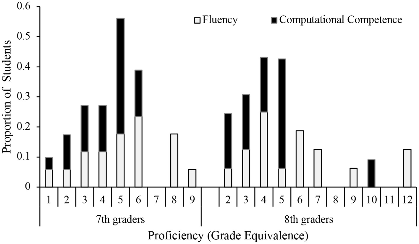 Proficiency scores expressed as proportion of students scoring at a certain grade level (N = 45 7th-graders; N = 48 8th-graders). There was a large variability in proficiency: While some students scored at the 1st- and 2nd-grade proficiency level, other students scored above their actual grade level. Average proficiency in math fluency was close to grade level for 7th grade students (M = 6.97, SD = 2.32), but below grade level for 8th grade students (M = 6.50, SD = 2.79). Average proficiency in calculation competence was substantially below grade level for both 7th (M = 4.55, SD = 1.36) and 8th grade students (M = 5.25, SD = 2.14). There was a significant correlation between fluency and calculation competence, r(24) = 0.70, p < 0.05.