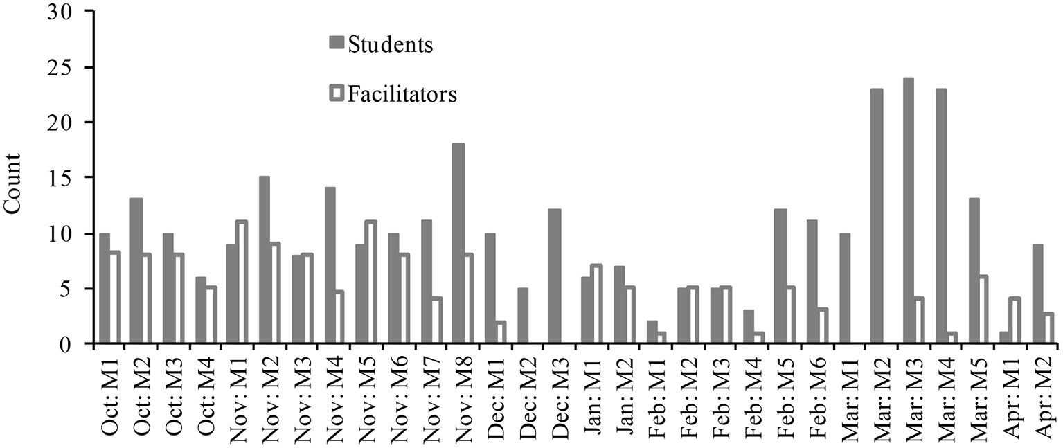 Attendance of students and facilitators across the year, plotted for each meeting (M).