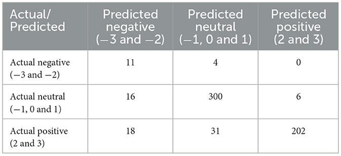 Nonetheless, while the F1 score slightly decreased in Round 3, recall improved significantly. This outcome is particularly relevant for sentiment analysis tasks that involve multi-level sentiment classification. The increase in recall suggests that the model is now more effective at capturing a broader range of sentiments, even if precision is slightly reduced (Alsagri and Sohail, 2024). A higher recall means that fewer true sentiment cases are missed, ensuring that strongly positive or negative expressions are correctly identified rather than misclassified as neutral. This is particularly beneficial for sentiment analysis applications in opinion mining, feedback analysis, and general social media monitoring, where failing to detect sentiment-laden expressions could lead to biased or incomplete insights. In contrast, a slight drop in precision (which contributed to the reduced F1 score) indicates that some sentiment predictions might be misclassified into neighboring sentiment levels, but they remain within the general spectrum of positive, neutral, or negative sentiment. This trade-off is often desirable in sentiment analysis as it is inherently subjective, and misclassifications between adjacent levels (e.g., slightly positive vs. neutral) are less critical than failing to detect sentiment altogether. By capturing a greater number of sentiment-laden cases, the model reduces the risk of overlooking significant trends in sentiment analysis. Considering this, and to complement the fine-grained evaluation, we also analyzed model performance using a coarser sentiment bucket scheme, grouping scores into negative (−3 and −2), neutral (−1 to 1), and positive (2 and 3). This approach yielded a notably higher F1 score (0.89) and overall accuracy (87.2%) in Round 3, suggesting that most classification discrepancies occur between adjacent sentiment levels rather than across polarity boundaries. These findings reinforce that the LLM reliably captures the general direction of sentiment, and that many so-called errors on the 7-point scale represent ordinal proximity rather than substantive misclassification. Despite the strong performance of our LLM sentiment classification model, our narrative analysis revealed key areas for future improvement that could further enhance its accuracy. The model effectively captured sentiment in most cases, but challenges remained in handling nuanced language, such as sarcasm, implicit criticism, and mixed sentiments, which were improved through the rounds but still have more room for development. These are common challenges to LLM sentiment analysis (Kheiri and Karimi, 2023).