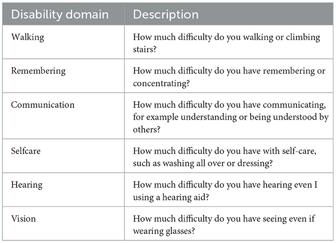 Washington Group on Disability Statistics, Z. Z. (2020). The Data Collection Tools Developed by the Washington Group on Disability Statistics and their Recommended Use. Available online at: https://www.washingtongroup-disability.com/fileadmin/uploads/wg/Documents/WG_Implementation_Document__1_-_Data_Collection_Tools_Developed_by_the_Washington_Group.pdf (Accessed June 3, 2025).