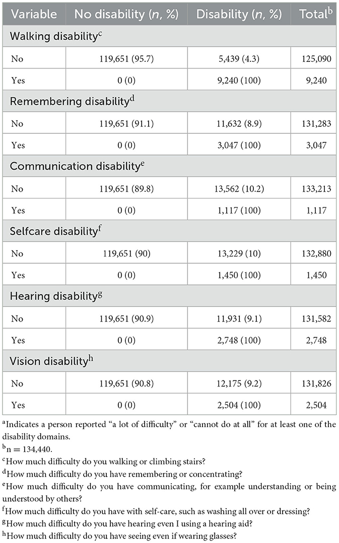 The dependent variable in the current study is whether a person is classified as having a disability based on their responses to the WG-SS items. Following the Washington Group's recommendations, if a person endorses “a lot of difficulty” or “cannot do at all,” they are considered as having a disability in the corresponding domain (Washington Group on Disability Statistics, 2020). People reporting at least one WG-SS disability are coded as 1; all others are coded as 0. Table 1 shows the six disability domains and the corresponding item on the survey.