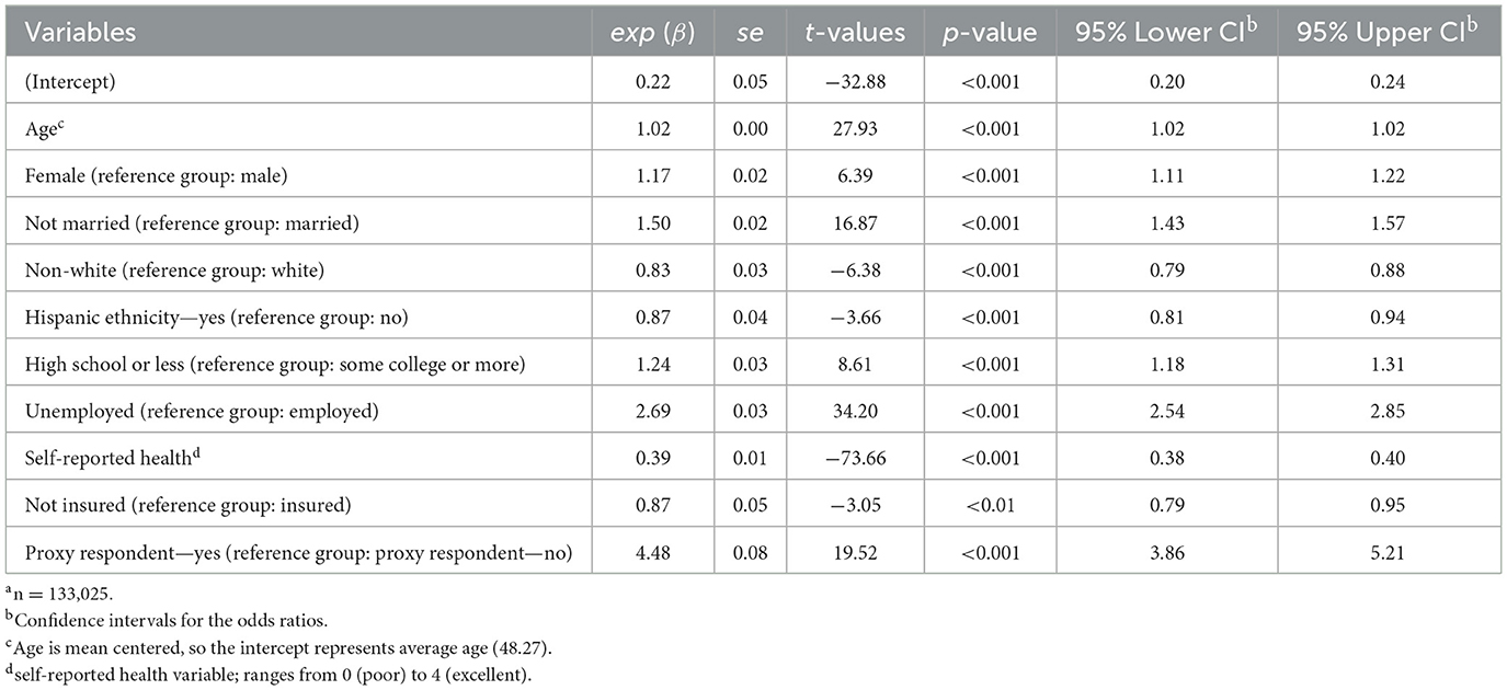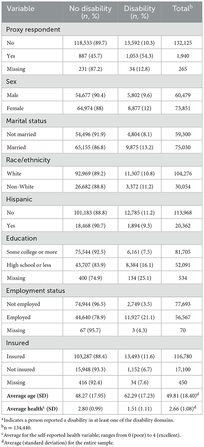 The sociodemographic variables used in the analysis were chosen because previous literature suggests they are associated with disability status, proxy respondent, or both. The included variables are as follows: age (18–85; Lauer et al., 2019; Mactaggart et al., 2016; Todorov and Kirchner, 2000), sex (0 = male, 1 = female; Elkasabi, 2021; Mactaggart et al., 2016; Lauer et al., 2019), marital status (0 = married, 1 = not married; Saito et al., 2024), race/ethnicity (0 = White, 1 = non-White; Lauer et al., 2019), Hispanic ethnicity (0 = no, 1 = yes; Lauer et al., 2019), education (0 = some college or more, 1 = high school or less; Elkasabi, 2021; Hall et al., 2022a; Shandra, 2018), employment status (0 = employed, 1 = not employed; Amilon et al., 2021; Hendershot, 2004; Shandra, 2018), health (0 = poor to 4 = excellent; Amilon et al., 2021; Amilon and Christensen, 2025; Li et al., 2015), and insurance coverage (0 = has coverage, 1 = no coverage; Kaye, 2019).