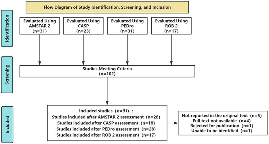 The dataset included 31 AMSTAR 2 assessments of systematic reviews (Gomes-Neto et al., 2024), 23 CASP assessments of primary studies (Peng et al., 2023), 31 PEDro scores of randomized controlled trials (Blagrove et al., 2018), and 17 ROB 2 risk-of-bias evaluations (Milanović et al., 2022). After excluding incomplete records, inaccessible full texts, retracted publications, and metadata-deficient entries, 91 studies remained and were used in the concordance analysis between LLMs and human raters. While the dataset was domain-specific, the selected instruments are widely applied in medicine, education, and social sciences. Therefore, the results are expected to provide insights that are transferable across disciplines, although generalization beyond sports science should be interpreted cautiously. The inclusion process is detailed in Figure 1.