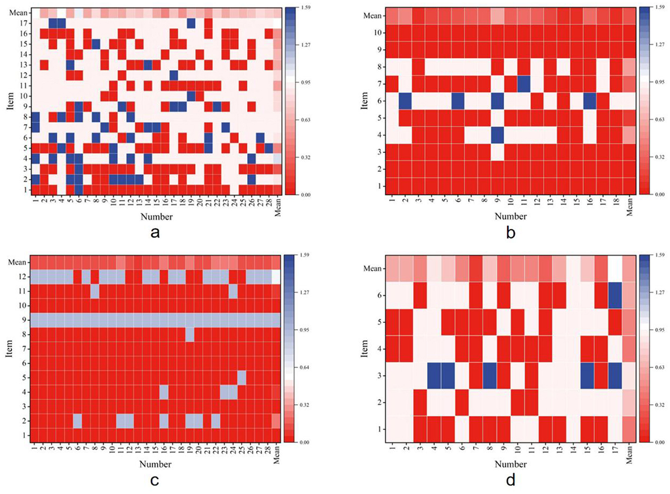 Figure 2. Entropy heatmaps of consistency across four literature-quality appraisal tools. (a) AMSTAR 2, (b) CASP, (c) PEDro, (d) ROB 2.