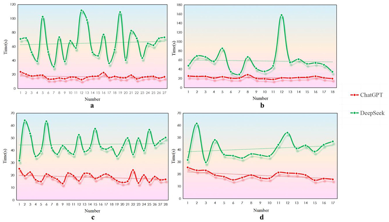 Figure 3. Processing-time differences between ChatGPT-4.0 and DeepSeek R1 during literature-quality appraisal. (a) AMSTAR 2, (b) CASP, (c) PEDro, (d) ROB 2.