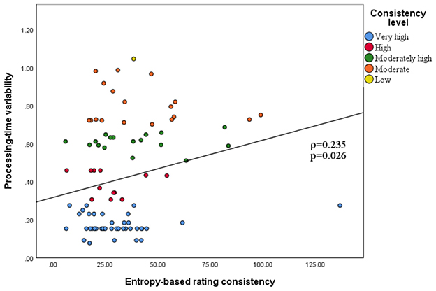Spearman's rank-order analysis revealed a modest yet statistically significant positive association between processing-time variability and entropy (ρ = 0.235, p = 0.026). Hence, greater fluctuations in generation time were associated with lower agreement, as reflected by higher entropy values. As illustrated in Figure 4, articles that achieved “very high consistency” clustered in the region of minimal time variation, whereas the proportion of lower-consistency cases increased with greater variability. The coefficient of determination was low (R2 = 0.055), indicating that processing-time instability explained only a small proportion of the variance in entropy and is unlikely to represent the main determinant of rating disagreement.