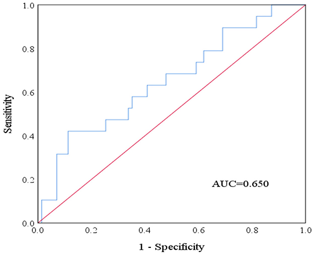 To establish an operational threshold for practical application, we defined items with moderate or lower rating consistency (entropy > 0.7) as the target condition and performed a receiver operating characteristic (ROC) curve analysis using processing-time variability as the test variable. Figure 5 illustrates that the area under the curve (AUC) was 0.650 (p = 0.045), indicating a moderate level of discriminative performance. The optimal cutoff point, determined by the maximum Youden index (Se + Sp – 1), was 45.795 s (rounded to 46 s), with a sensitivity of 0.421 and a specificity of 0.887. Thus, when the model's processing-time variability for a single article exceeded 46 s, the probability of producing a rating with moderate or lower consistency increased significantly. This threshold may serve as a practical reference for initiating manual review in AI-assisted appraisal workflows.