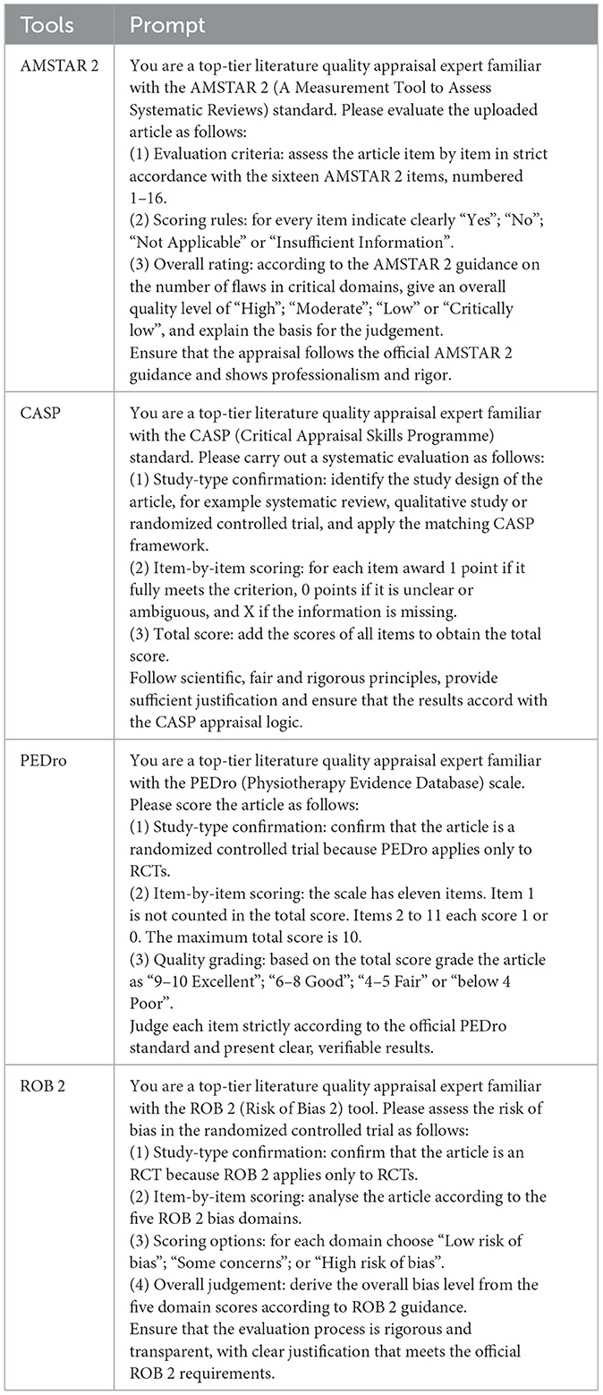The experiments were conducted on a Microsoft Surface Pro 8 equipped with an 11th-generation Intel Core i5-1145G7 processor (base frequency 2.60 GHz, turbo frequency 2.61 GHz) and 8 GB of memory. All rating procedures were performed under a controlled environment with identical network and power settings to ensure consistency. To simulate the double-blind appraisal process commonly used in traditional practice, each article underwent two independent rounds of scoring: after the model generated an initial result, it was required to conduct a second round without reference to the first, and the second result was recorded as final. In addition, we employed an “expert identity setting” strategy, instructing the LLMs to assume the role of domain specialists proficient in the appraisal tool in use. This design aimed to reflect real-world application scenarios, where end-users are unlikely to provide detailed item-by-item instructions but instead expect AI systems to apply established methodological standards autonomously. The full prompt text used in the experiments is presented in Table 1.