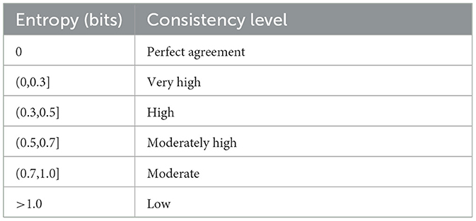 For each article, we first calculated the item-level entropy and then the overall entropy from the distribution of rating categories. Consistency levels were assigned according to these entropy values. The procedure is outlined below.