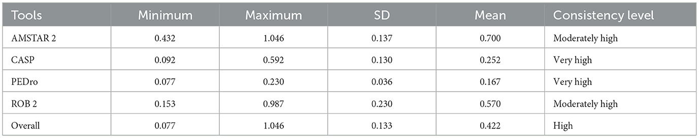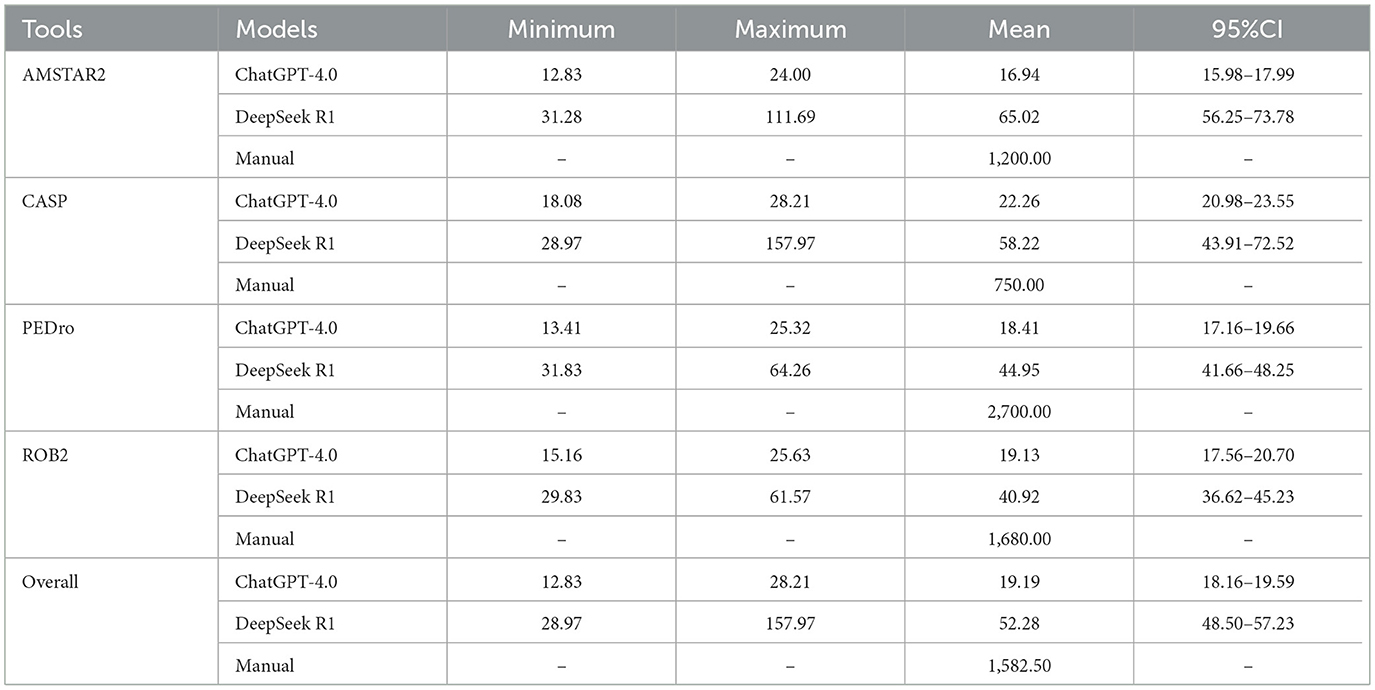 The two LLMs completed quality ratings substantially faster than human reviewers. Across all four appraisal tools, ChatGPT-4.0 required a mean of 19.19 s per article, whereas DeepSeek R1 averaged 52.28 s, yielding a combined mean of 33.09 s. Published benchmarks for manual appraisal are considerably longer: approximately 20 min for a full AMSTAR 2 assessment (De Santis and Matthias, 2023), 10–15 min for PEDro (Physiotherapy Evidence Database, 2025), 30 min for RoB 2 (Richter and Hemmingsen, 2025), and 30–60 min for a 10-item qualitative checklist analogous to CASP (Duval et al., 2023). Overall, the LLMs were about 47.8 times faster than the human appraisal workflow. A detailed comparison is provided in Table 4.