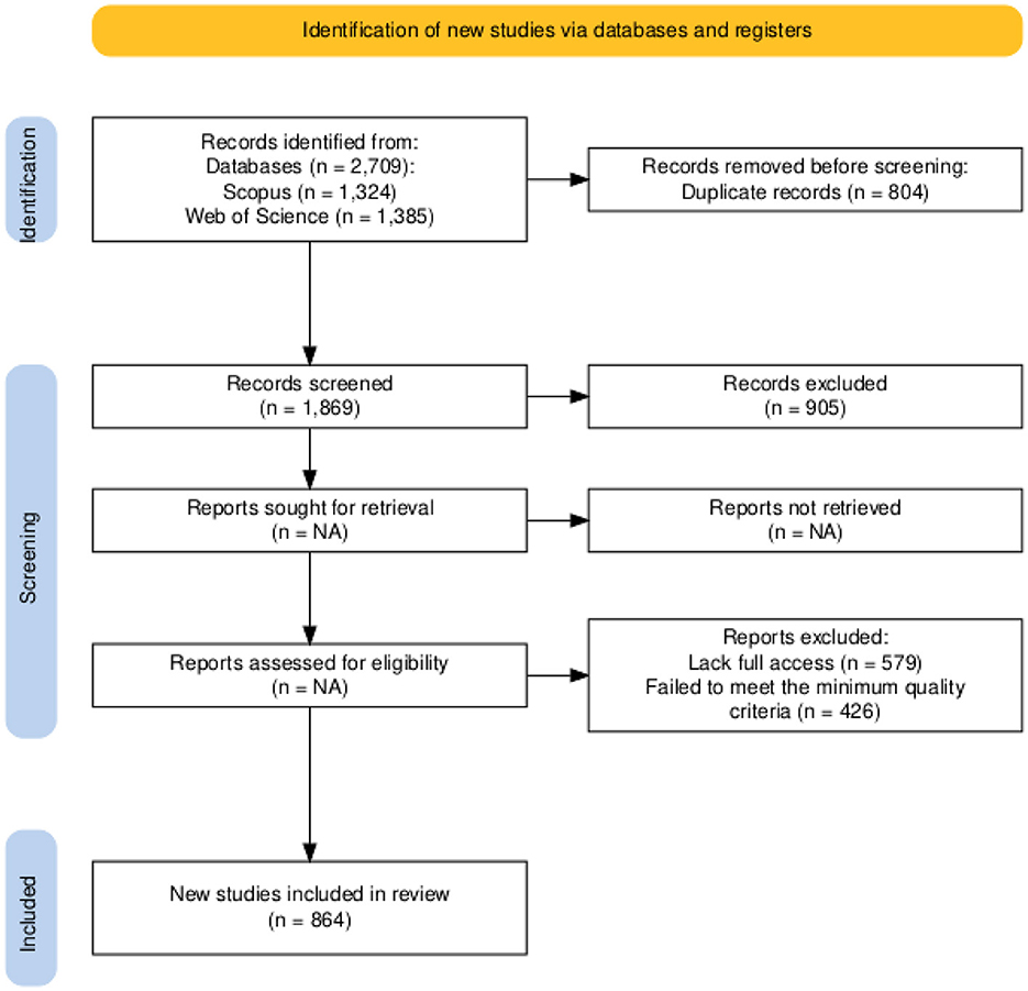 Flowchart of the study selection process for reviewing new studies. Initially, 2,709 records were identified: 1,324 from Scopus and 1,385 from Web of Science. After removing 804 duplicates, 1,869 records were screened, excluding 905. Reports sought and assessed for retrieval had unspecified numbers. Reports were excluded due to lack of full access (579) and failing to meet criteria (426). A total of 864 new studies were included in the review.