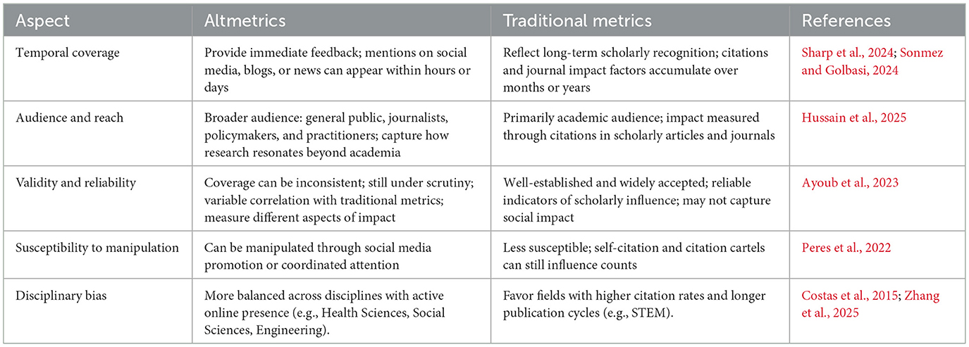 The comparison between altmetrics and traditional metrics reveals distinct strengths and limitations across several dimensions (Table 1). In terms of temporal coverage, altmetrics provide immediate feedback through online platforms such as social media, blogs, and news outlets, capturing early attention and engagement shortly after publication (Sharp et al., 2024; Sonmez and Golbasi, 2024). Traditional metrics, in contrast, reflect long-term academic recognition, as citation counts accumulate over months or years, offering a more stable measure of sustained scholarly influence. Regarding audience and reach, traditional indicators are confined to academic circles, whereas altmetrics extend the scope of impact by incorporating interactions from broader audiences, including the general public, journalists, and policymakers (Hussain et al., 2025). However, questions of validity and reliability persist. While traditional metrics are well-established and standardized, altmetrics remain inconsistent and show variable correlations with citation counts, suggesting they capture different dimensions of impact (Ayoub et al., 2023). Another critical issue is susceptibility to manipulation: altmetrics are particularly vulnerable due to the ease of generating online attention, whereas traditional metrics, though not immune to self-citations or citation cartels, are generally less prone to artificial inflation (Peres et al., 2022). Finally, both systems exhibit disciplinary bias, altmetrics tend to favor fields with strong digital visibility and public engagement, such as health and social sciences, while traditional metrics privilege established disciplines with dense citation networks, often underrepresenting emerging or interdisciplinary research areas.