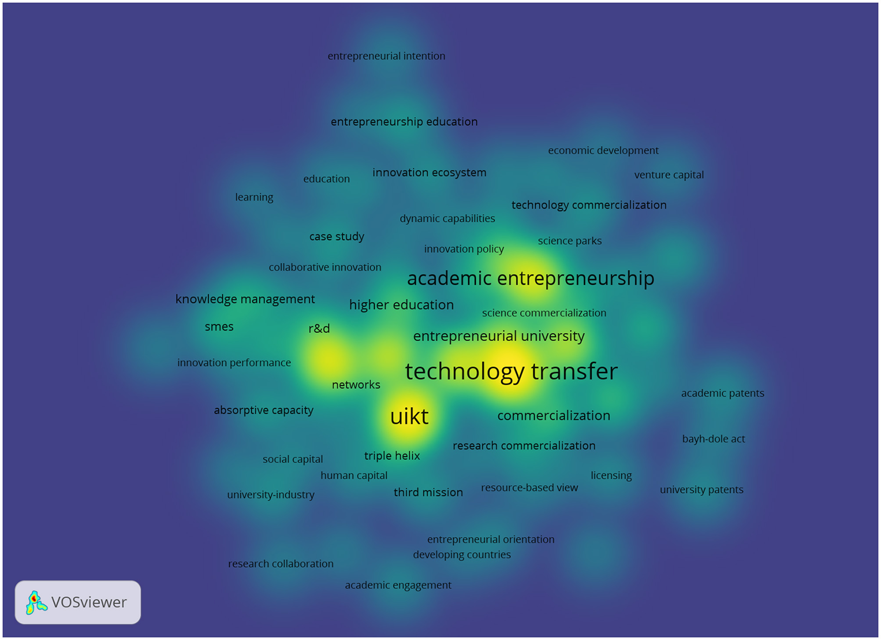 The analysis uncovered five dominant keyword clusters: “technology transfer,” “university–industry knowledge transfer (UIKT),” “knowledge transfer,” “academic entrepreneurship,” and “university,” which collectively define the field's conceptual architecture. Geographically, the United Kingdom leads in publication output, while Research Policy and The Journal of Technology Transfer emerge, respectively, as the most cited and the most prolific journals. Network metrics further highlight key author and institution hubs that bridge thematic communities.