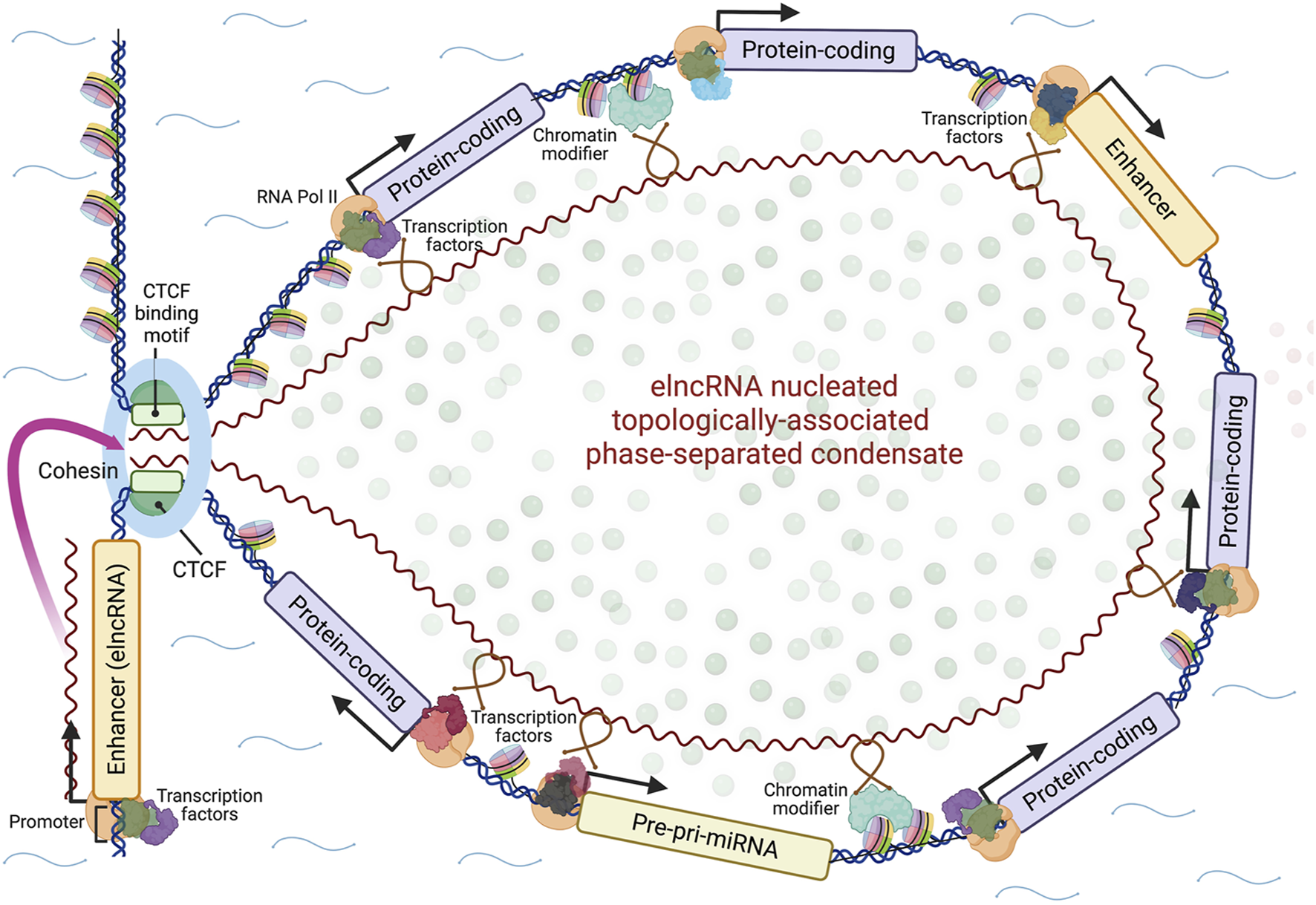 There are two unresolved major features of molecular biology and genetics: lncRNAs and enhancers, both estimated to number in the hundreds of thousands in mammals. The emergent picture is that 1) enhancers comprise their promoters and the RNAs that are transcribed from them and 2) a major subclass of lncRNAs is elncRNAs, whose function is to regulate chromatin architecture and thereby expression of protein-coding and other RNAs (including potentially miRNAs, antisense RNAs and other elncRNAs in a developmental feed-forward fashion), through physical mechanisms that involve recognition of transcription factors, chromatin-modifying complexes, RNA binding and other effector proteins containing IDRs, as well as their genomic target sequences via R-loops or triplexes (Soibam, 2017; Cetin et al., 2019; Mishra and Kanduri, 2019; Cai et al., 2020; Farabella et al., 2021), to form topologically-associated domains that act as developmental stage-specific transcriptional and splicing hubs.