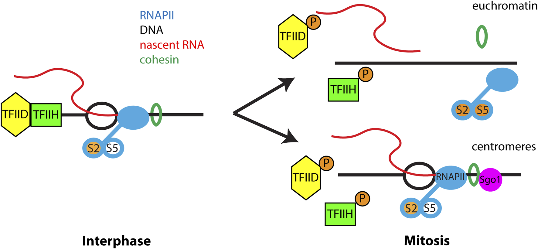 FIGURE 1. Transcriptional regulation during mitosis. During interphase RNAPII actively transcribes chromatin and is phosphorylated at Ser 2 of the C-terminal domain during transcriptional elongation. Serine-5 of the CTD is phosphorylated during transcriptional pausing and is absent from elongating RNAPII. TFIID and TFIIH present at promoter regions are important for transcriptional initiation. Cohesin regulates RNAPII transcription through an unknown mechanism. During mitosis phosphorylation of TFIIH, TFIID and hyperphosphorylation of RNAPII block new transcription initiation. In addition, phosphorylation of multiple proteins trigger release of cohesin from euchromatin which is important for removal of elongating RNAPII from chromosome arms. However, at centromeres Sgo1 protects cohesin from removal from chromatin, leading to retention of RNAPII at the mitotic centromere. Importantly, only elongating RNAPII is retained at mitotic centromeres and all factors and RNAPII modifications associated with transcriptional initiation and pausing are absent from the centromere.