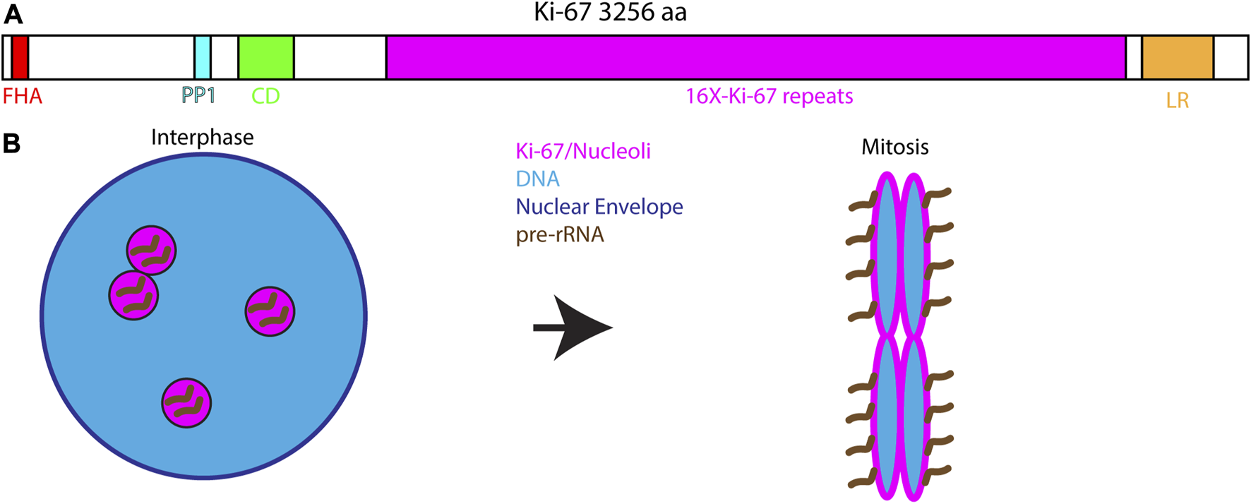 FIGURE 3. Ki-67 and the perichromosomal layer. (A). Domain structure of Ki-67 depicting the major conserved domains: A N-terminal Forkhead-associated domain (FHA) that recognizes phosphorylated proteins, a Protein Phosphatase 1 interacting motif, a Conserved Domain of unknown function, 16 repeats of a simple Ki67-specific repeat that is heavily phosphorylated during mitosis and a C-terminal Leucine/Arginine-rich domain important for interacting with DNA and chromatin. (B). During interphase Ki-67 localizes to the nucleolus where it is associated with pre-rRNA. At the onset of mitosis Ki-67 redistributes to the chromosomal surface where it serves and the assembly point for the perichromosomal layer. Ki-67 is necessary for targeting the entire perichromosomal layer to the chromosome surface during mitosis including pre-rRNA.