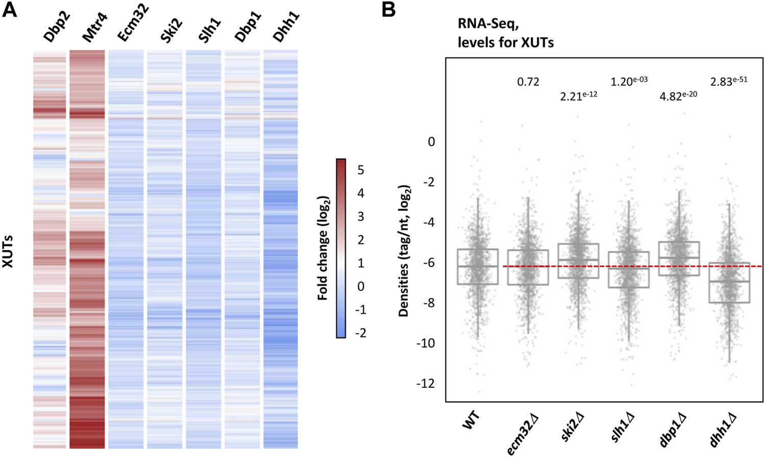 This idea that Dbp2 and Mtr4 could contribute to regulate the expression of XUTs was based on the observation that two of them, namely, XUT0741 and XUT1678 (antisense to the ADH2 and ARG1 mRNAs, respectively), accumulate in dbp2Δ cells or upon depletion of Mtr4 (Wery et al., 2016). However, the effect of these helicases on the entire XUTs family remained unexplored.