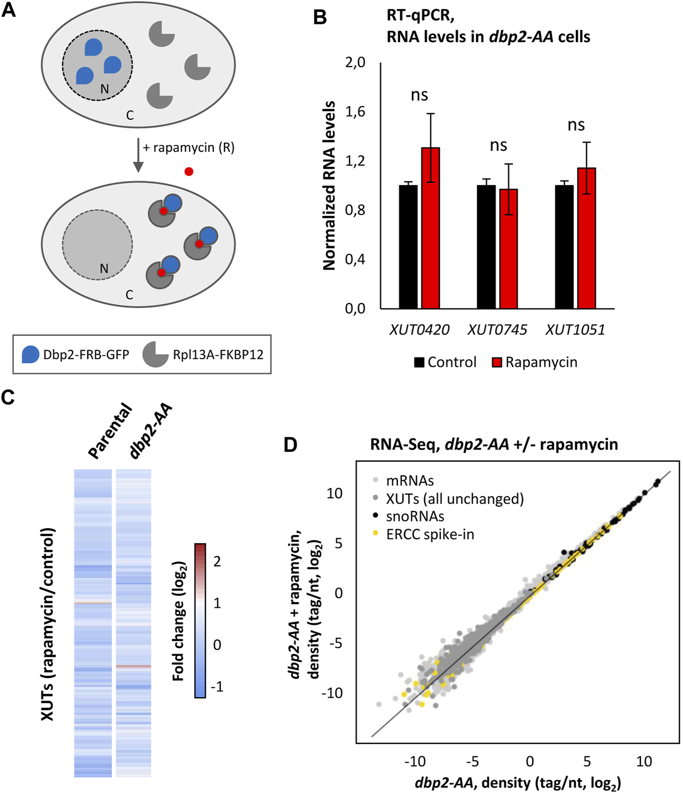 XUTs are insensitive to Dbp2 nuclear depletion. (A) Schematic representation of the Dbp2 anchor-away experiment. (B) YAM2673 (dbp2-AA) cells were grown to mid-log phase, at 30°C, in YPD medium and then treated for 60 min with 1 μg/mL (final concentration) of rapamycin. After total RNA extraction, the levels of XUT0420, XUT0745 and XUT1051 were assessed by strand-specific RT-qPCR, and then normalized on the PMA1 mRNA (unaffected housekeeping gene). The normalized level of each XUT in the untreated condition was set to 1. Mean and SD values were calculated from three independent biological replicates. ns, not significant upon t-test. (C) Total RNA-Seq was performed using total RNA extracted from YAM2672 (parental) and YAM2673 (dbp2-AA) cells grown as above. The data are presented as a heatmap of the expression fold-change (log2) for XUTs in WT and dbp2-AA cells following rapamycin treatment relative to the untreated control condition. (D) RNA-Seq signals in YAM2673 (dbp2-AA) cells grown as above and treated or not with rapamycin. The data are presented as densities (tag/nt, log2 scale) for mRNAs (light grey), XUTs (dark grey) and snoRNAs (black) upon normalization on the ERCC spike-in (yellow).