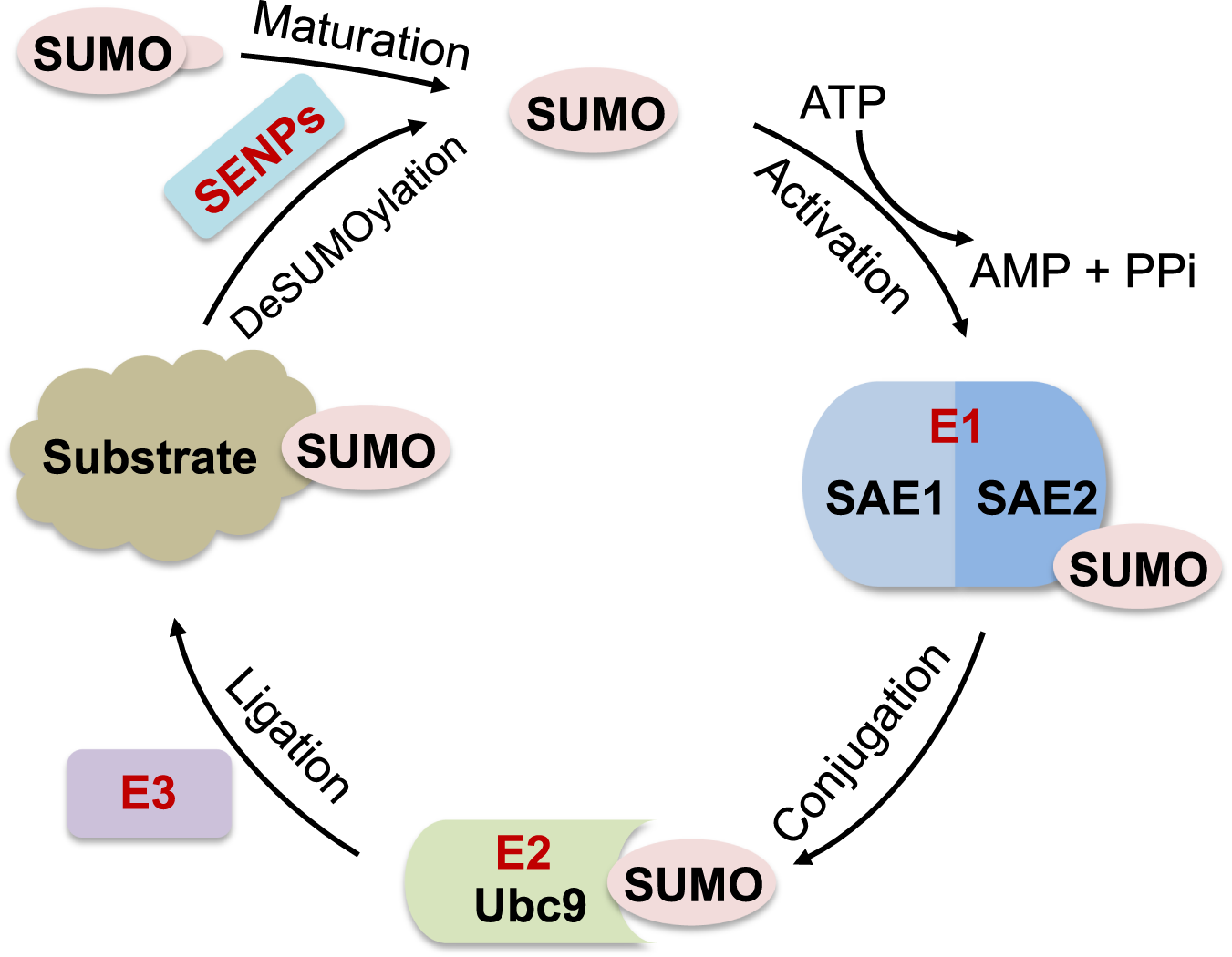 Diagram of SUMOylation pathway. SUMO precursors are cleaved by SUMO proteases (SENPs) to generate mature SUMOs with di-glycine at their C-terminus, which forms a thioester bond with the heterodimeric SUMO E1 (SAE1/SAE2) in an ATP-dependent manner. Activated SUMO is then transferred to SUMO E2 (Ubc9) also via forming a thioester bond with Ubc9. Finally, Ubc9 conjugates SUMO to substrates, which is facilitated by a SUMO E3. SUMOylated protein substrates can be deSUMOylated by SUMO proteases.