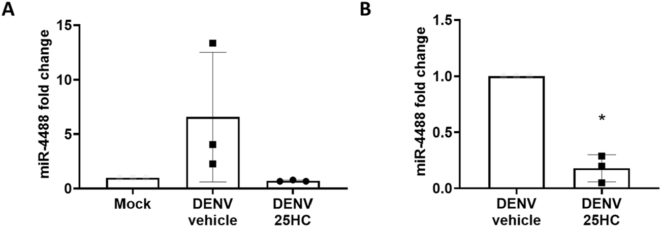 Figure 2. Huh7 cells infected with Dengue virus have higher levels of miR-4488 while cells pre-treated with 25HC pre-infection show reduced levels of miR-4488. Cells were pre-treated for 24 h with 5 μM 25HC or mock (ethanol) in 2% serum media before infection with Dengue at an MOI of 0.1 for 48 h. Levels of miR-4488 were quantified via Taqman RT-qPCR and normalized to non-infected mock (A) or to an infected and vehicle treated control (B). n = 3 biologically independent replicates, error bars represent standard deviation. Significance was assessed by two-tailed, unpaired student’s t-test, *p < 0.05.