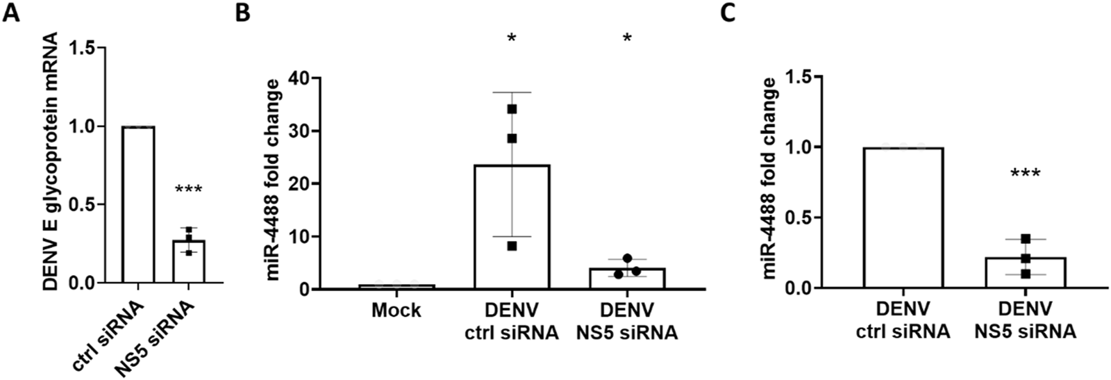 An NS5-targetting siRNA reduces levels of DENV2 virus and miR-4488. (A) An NS5-targeting siRNA is antiviral against DENV2. Cells were pre-transfected with 100 nM siRNA for 6 h before infection with Dengue at an MOI of 0.01 for 72 h (B) Huh7 cells infected with Dengue virus have higher levels of miR-4488 while cells pre-transfected with an NS5-targeting siRNA pre-infection show reduced levels of miR-4488. Levels of miR-4488 were quantified via Taqman RT-qPCR and normalized to non-infected mock (B) or vehicle treated controls (C). n = 3 biologically independent replicates, error bars represent standard deviation. Significance was assessed by two-tailed, unpaired student’s t-test, *p < 0.05, ***p < 0.001.