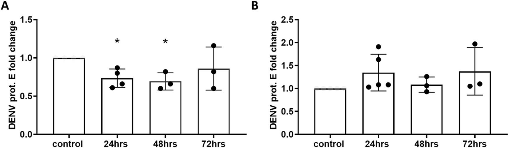 miR-4488 transfection reduces the levels of DENV RNA but inhibition does not significantly increase DENV RNA levels. Cells were transfected with either miR-4488 mimic (A) or inhibitor (B) for 24, 48 or 72 h before infection with DENV2 at an MOI of 0.1 for 48 h. Levels of DENV2 glycoprotein E RNA were quantified via RT-qPCR and normalized to a non-treated control. n = 3 biologically independent replicates. Significance was assessed by two-tailed, unpaired student’s t-test, *p < 0.05.