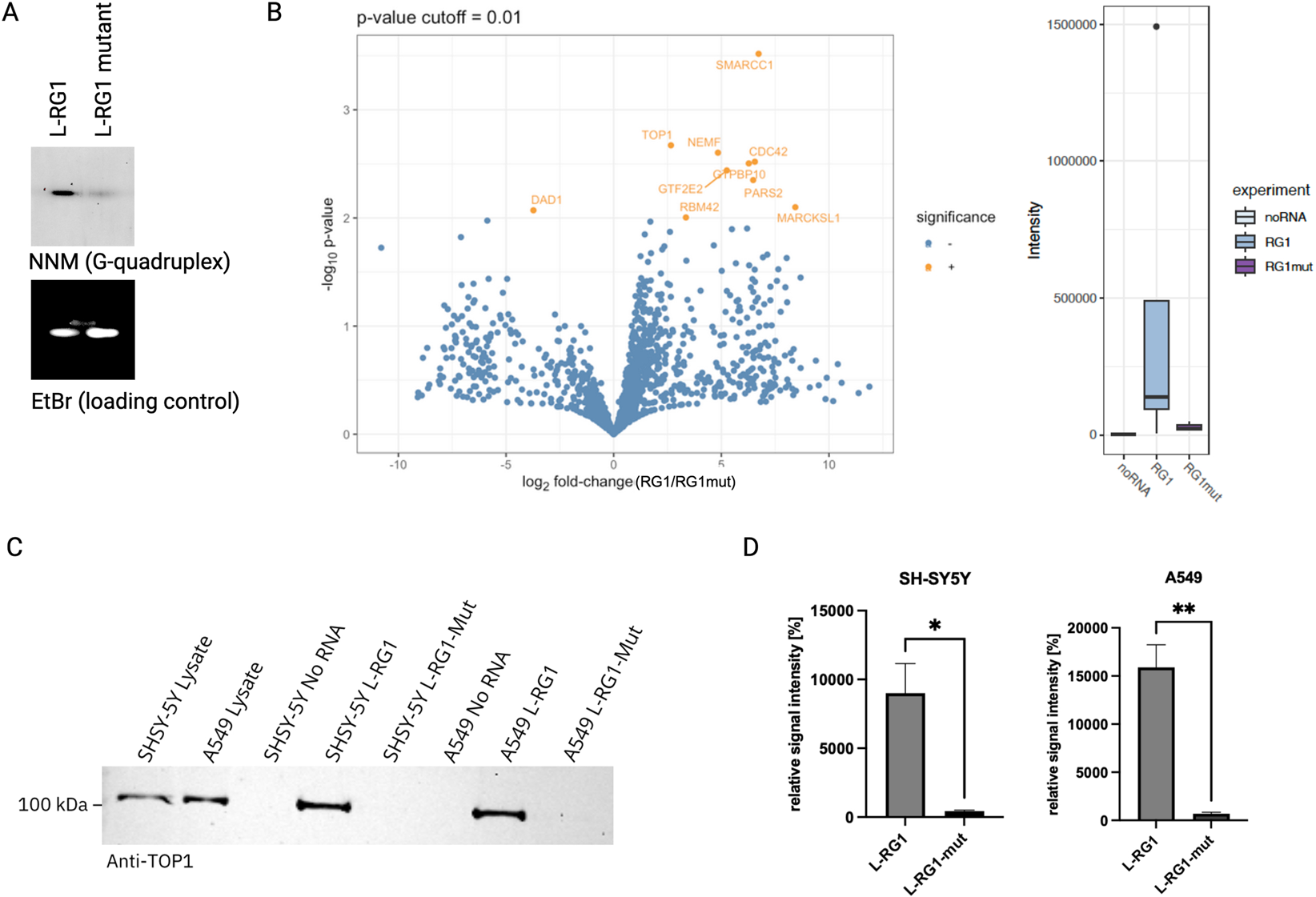 (A) NMM gel-assay. Native gel electrophoresis images showing that a G-quadruplex is present in L-RG1 but not in mutant L-RG1. Upper panel: samples stained with NMM to visualize G-quadruplex structures. Lower panel: counterstaining of the same gel with ethidium bromide (EtBr) as loading control. (B) Left: Volcano plot showing the differential protein enrichment in L-RG1 RNA pulldown samples compared to the noRNA control after data imputation. Proteins were identified using a timsTOF Pro in combination with a nanoUPLC. Quantification was performed using MaxQuant (2.0.1.0). Significance was determined using a p-value cutoff of 0.01, with significantly enriched proteins highlighted in orange. n = 5. Right: Binding profiles for DHX36, a known binder for G-quadruplex. Representation of binding intensity (control without RNA (noRNA), G-quadruplex binding (RG1) and binding to the mutated G-quadruplex (RG1mut)). (C) Validation of the mass spectrometry results by repeating the RNA pulldown assay with subsequent detection of TOP1 by Western blotting. The results confirm that TOP1 preferentially binds to the L-RG1 motif. (D) Quantification of the western blots shown in (C). Relative signal intensity incl. SEM is shown. Statistical analysis was done using unpaired t-test. *p = 0.0163; **p = 0.003; n = 3.