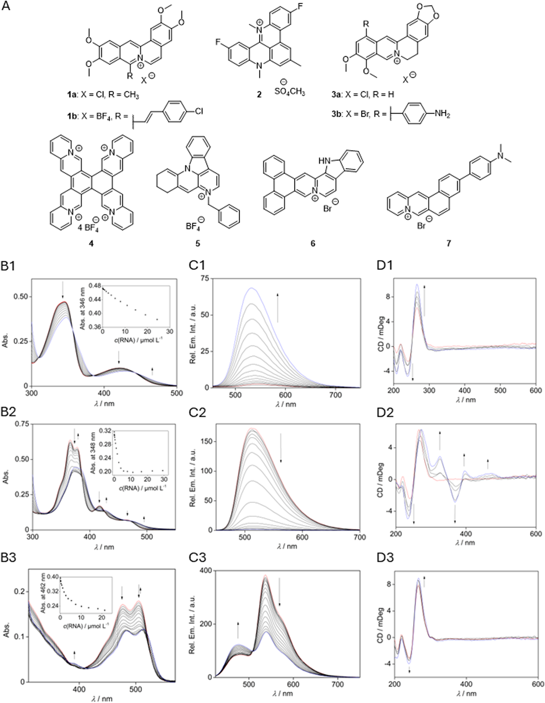(A) Compounds investigated as ligands for RG1 interactions. Photometric (B), fluorometric (C), and polarimetric (D) titrations with RG1 ((B,C)cRG1 = 285 µM with 5% v/v DMSO, (D)cRG1 = 20 µM) and berberine (3a; B1-D1) (Zee-Cheng and Cheng, 1972), tetraazoniapentaphenopentaphene (4; B2-D2) (Pithan et al., 2017), and naphthyridinium (5; B3-D3) (Nechepurenko et al., 2011). Red: spectrum before titration; blue: end of titration. Insets: absorption intensity at a specific wavelength plotted against the RNA concentration. Arrows indicate the change of intensity during the titration.