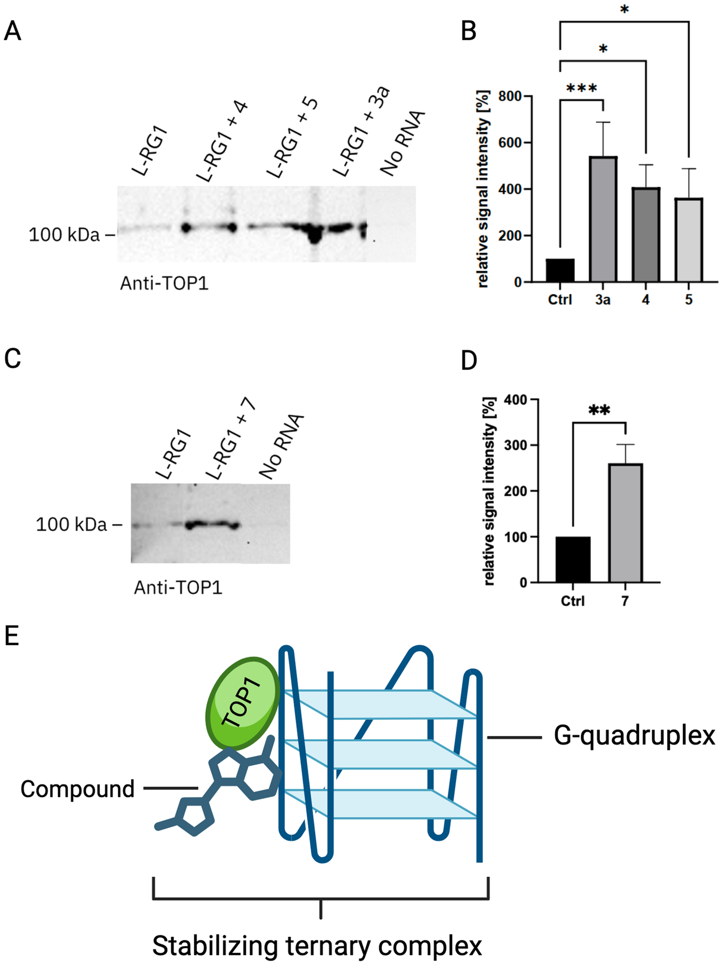 Semiquantitative analysis of the change in relative signal intensity of the L-RG1 band upon treatment with different compounds. (A) Exemplary TOP1 blot showing the untreated control and three samples treated with the compounds tetraazoniapentaphenopentaphene (4), naphthyridinium (5), and berberine (3a) at a final concentration of 100 µM. (B) Quantification of the relative signal intensity incl. SEM. Statistical analysis was done using a Friedman test for multiple comparisons. ***p ≤ 0.0006; *p ≤ 0.04; n = 8. (C) Exemplary TOP1 blot showing the untreated control and a sample treated with dimethylaminonaphthochinolizinium (7) at a final concentration of 100 µM. (D) Quantification of the relative signal intensity incl. SEM. Statistical analysis was performed using unpaired t-test. *p ≤ 0.0312; n = 6. (E) Schematic of a ternary complex formation, facilitated by the interaction of TOP1, RNA-G-quadruplex and a chemical compound. This interaction might stabilize the G-quadruplex RNA, thereby exhibiting a possibly antiviral effect.