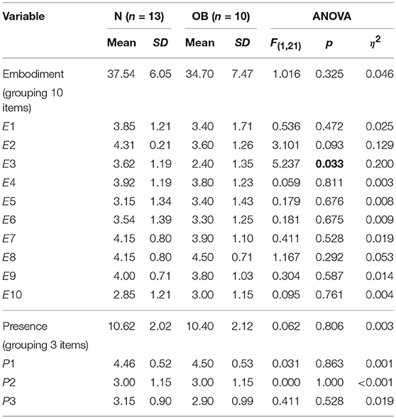 Several studies have shown that, through virtual BOIs (i.e., with a virtual body or body parts) participants associated their virtual body as their own (Slater et al., 2010; Maselli and Slater, 2013), which is likely to lead to cognitive (cf. Peck et al., 2013; Bergström et al., 2016; perceptual cf. Normand et al., 2011; Kilteni et al., 2012b, or behavioral changes, see Banakou et al., 2013; Kilteni et al., 2013; Slater and Sanchez-Vives, 2014).
