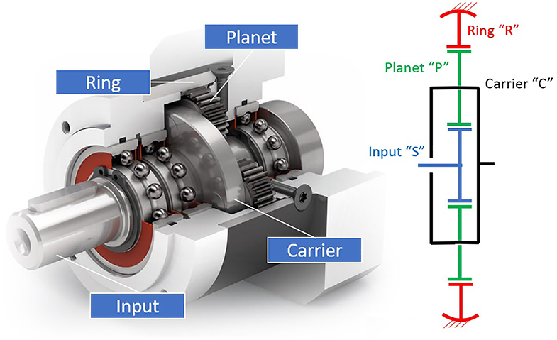 Figure 2. Internal arrangement of a Neugart gearhead indicating its main elements, adapted from Neugart (2020) with permission of © Neugart GmbH. It includes also a schema of its underlying topology.