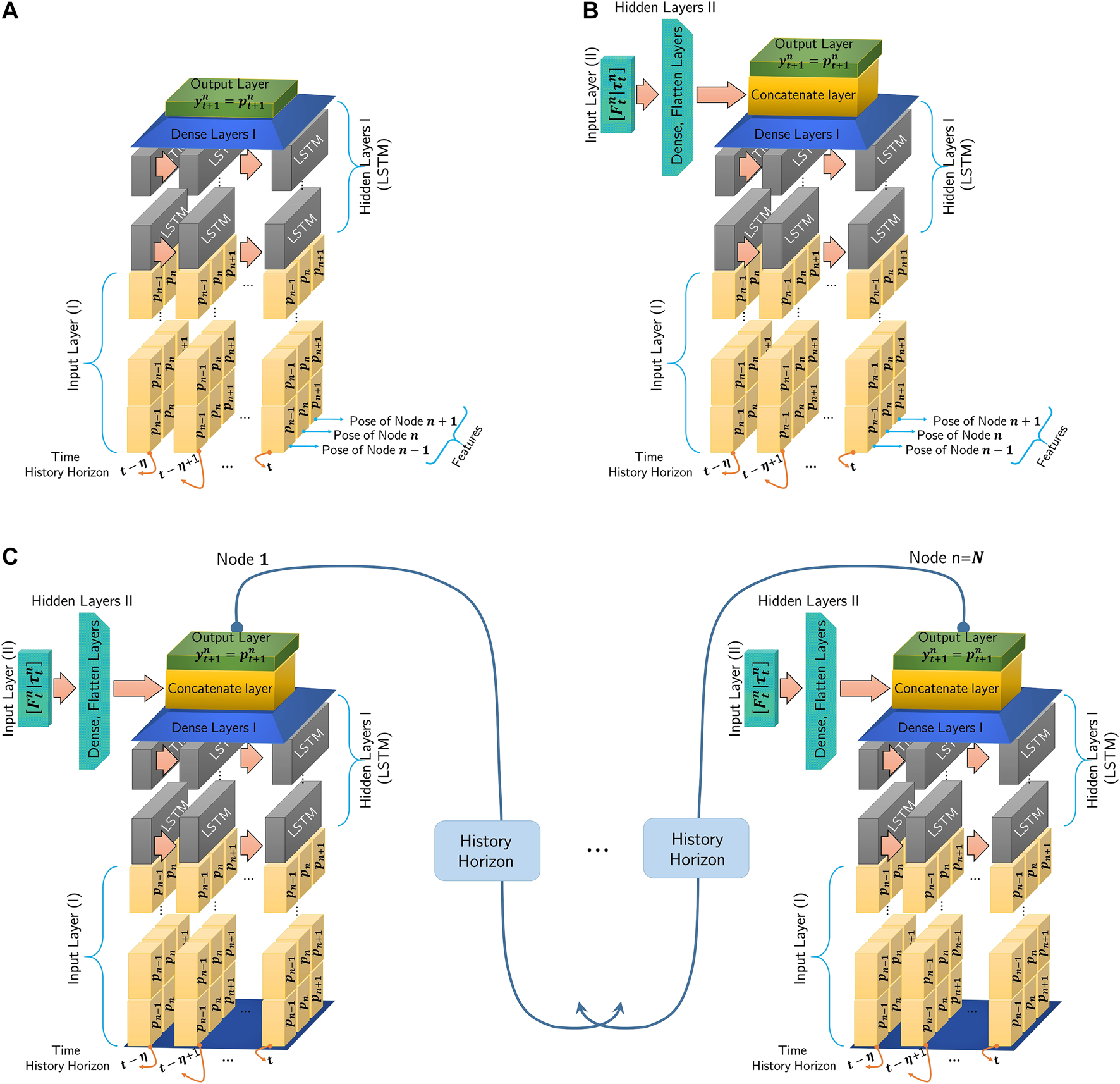 For the training process, data-sets contain time-sequence inputs and forces and torques applied to each node. Also, for each node, the poses of the node and its neighbors are considered features, as shown in Figure 2A,B. The first and second input layers proceed through LSTM layers and dense layers as hidden layers, respectively. Finally, output layers have resulted from fully connected layers.