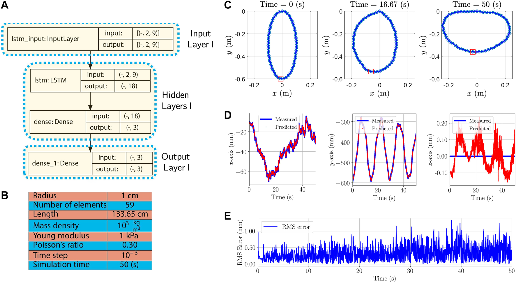 First simulation example: (A): The model architecture used for the first simulation example. The first stage is the Input layer, the intermediate stages are the Hidden layers, and the last stage is the Output layer. The first dimension of inputs and outputs in each layer are unspecified and can vary with the size of batches. (B): Rod properties and simulation parameters used in the first example. (C): Initial and time-evolved configurations. Positions of node specified by a red rectangle are measured and predicted. (D): Measured position calculated from analytical dynamic model and predicted by the proposed RNN-based model in the , , and -axes are given. (E): RMS error considering all the axes.