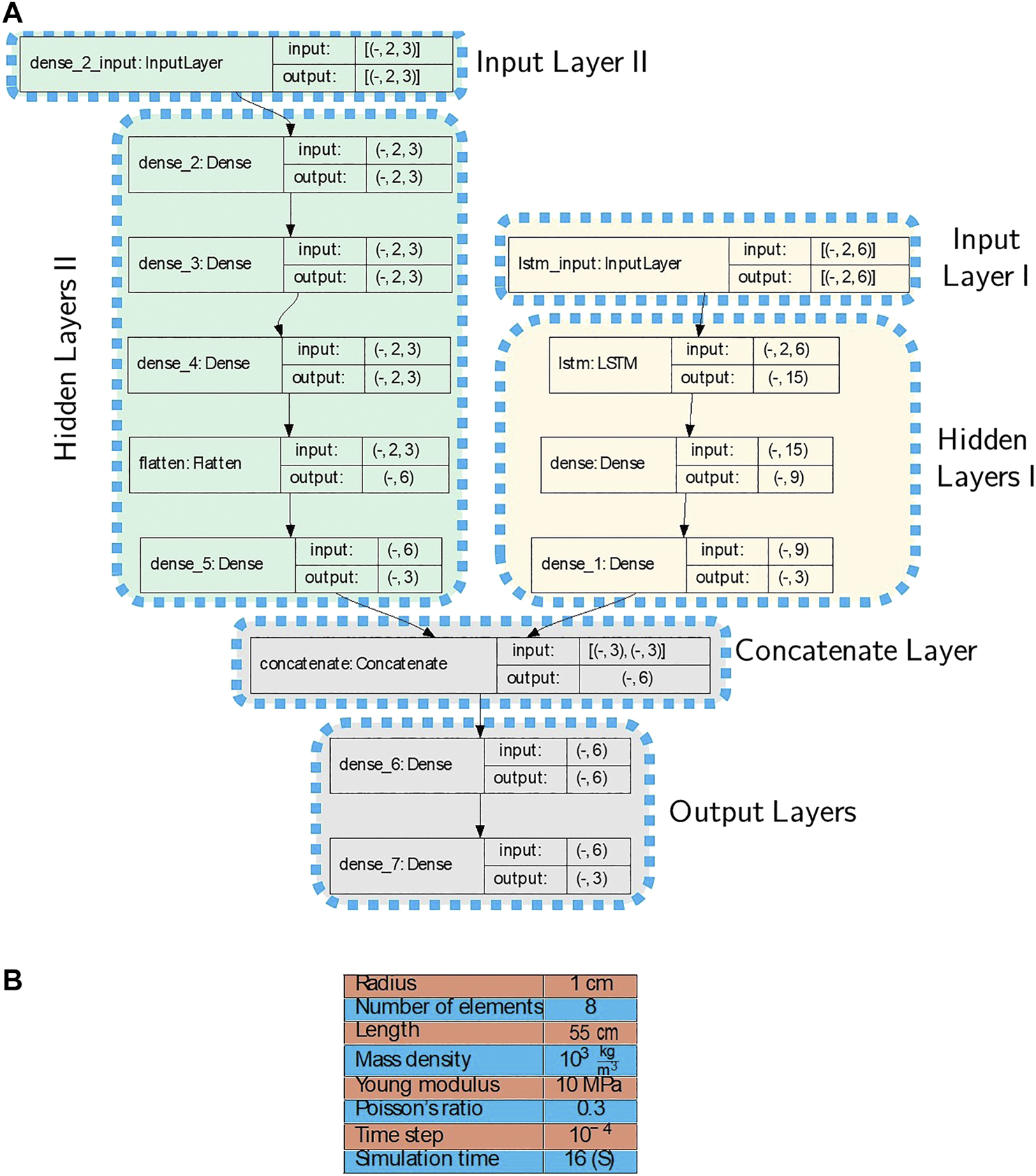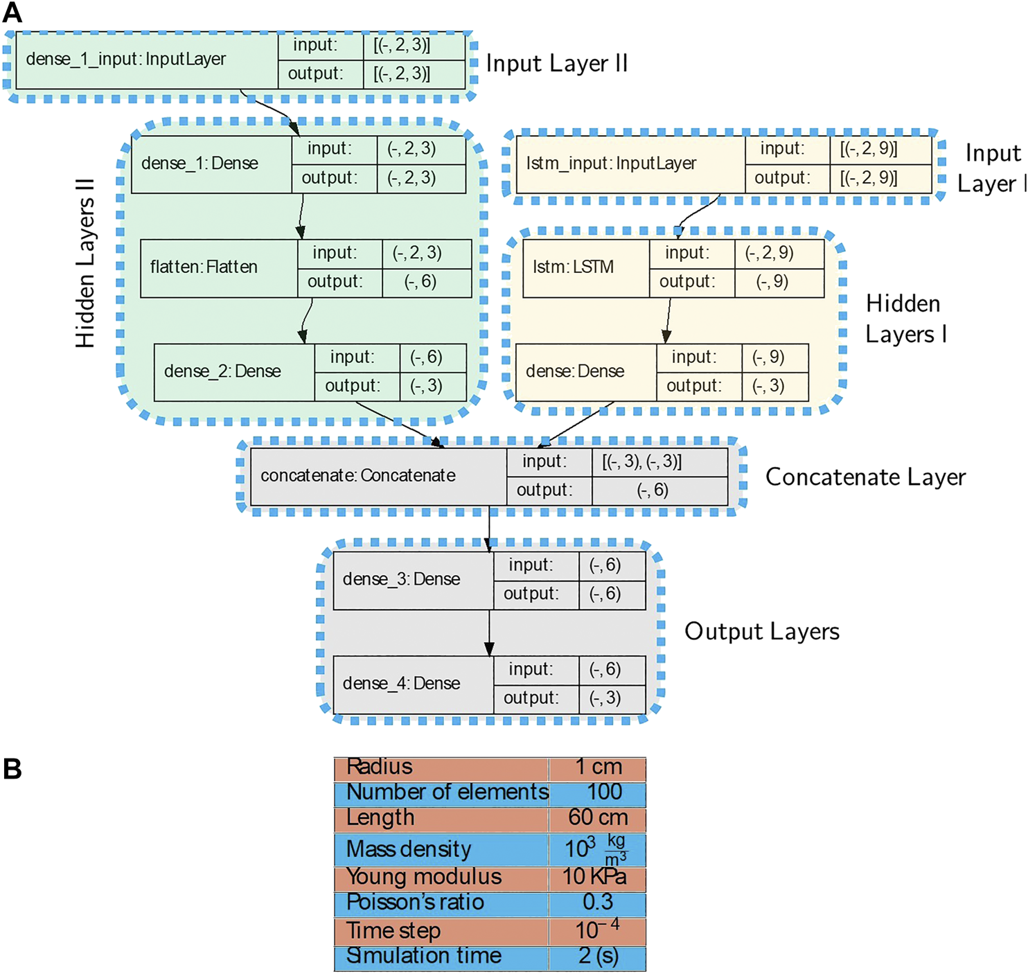 20,001 position and force samples are generated from the analytical model for each node. We augment 1-by-3 position vectors of Node 15th and its adjacent nodes at each time step. Therefore, the augmentation results in a 1-by-9 vector. Furthermore, the size of history horizons is chosen to be 2 (). Finally, augmented 2-by-9 tensors are obtained for each time steps which are fed to the model as the Input Layer I. The same preparation process are applied for the force data samples which are used as the Input Layer II. The prepared data-set is called Data-set III and 60% of the data is used for training process. The architecture in Figure 7A shows the Input layers I and II consist of tensors of size and , respectively. The first dimension of all layers are reserved for batch sizes and for the training, the batch size 1 was chosen. In the architecture of the model in Figure 7A, the Input, Hidden and Output Layers I and II together with the number of nodes and type of layers are demonstrated according to Figure 2B.