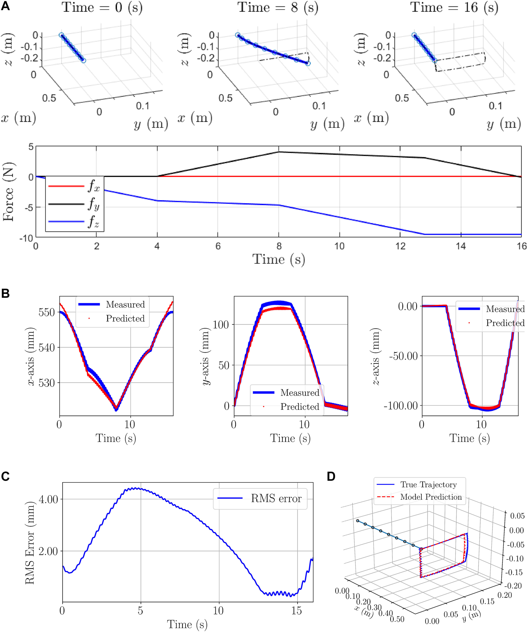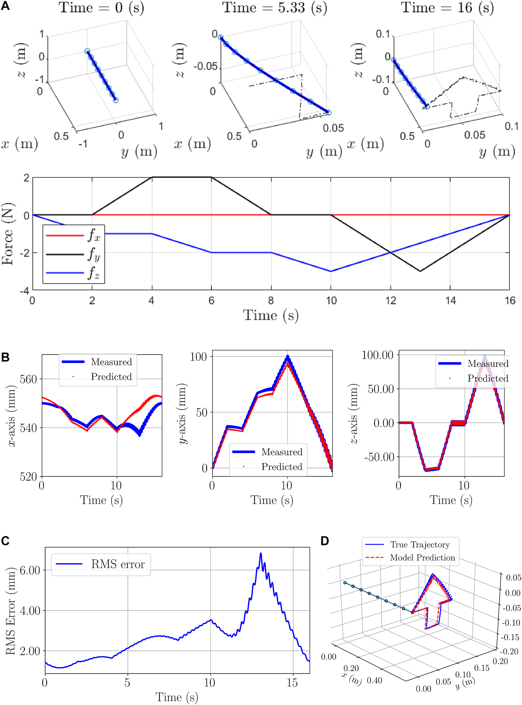 Second simulation example: (A): Initial, Time-evolved configurations and forces on the last node. (B): Tip positions: calculated from the analytical dynamic model and predicted by the proposed RNN-based model. (C) RMS error considering all the axes. (D) Predicted and measured trajectories.