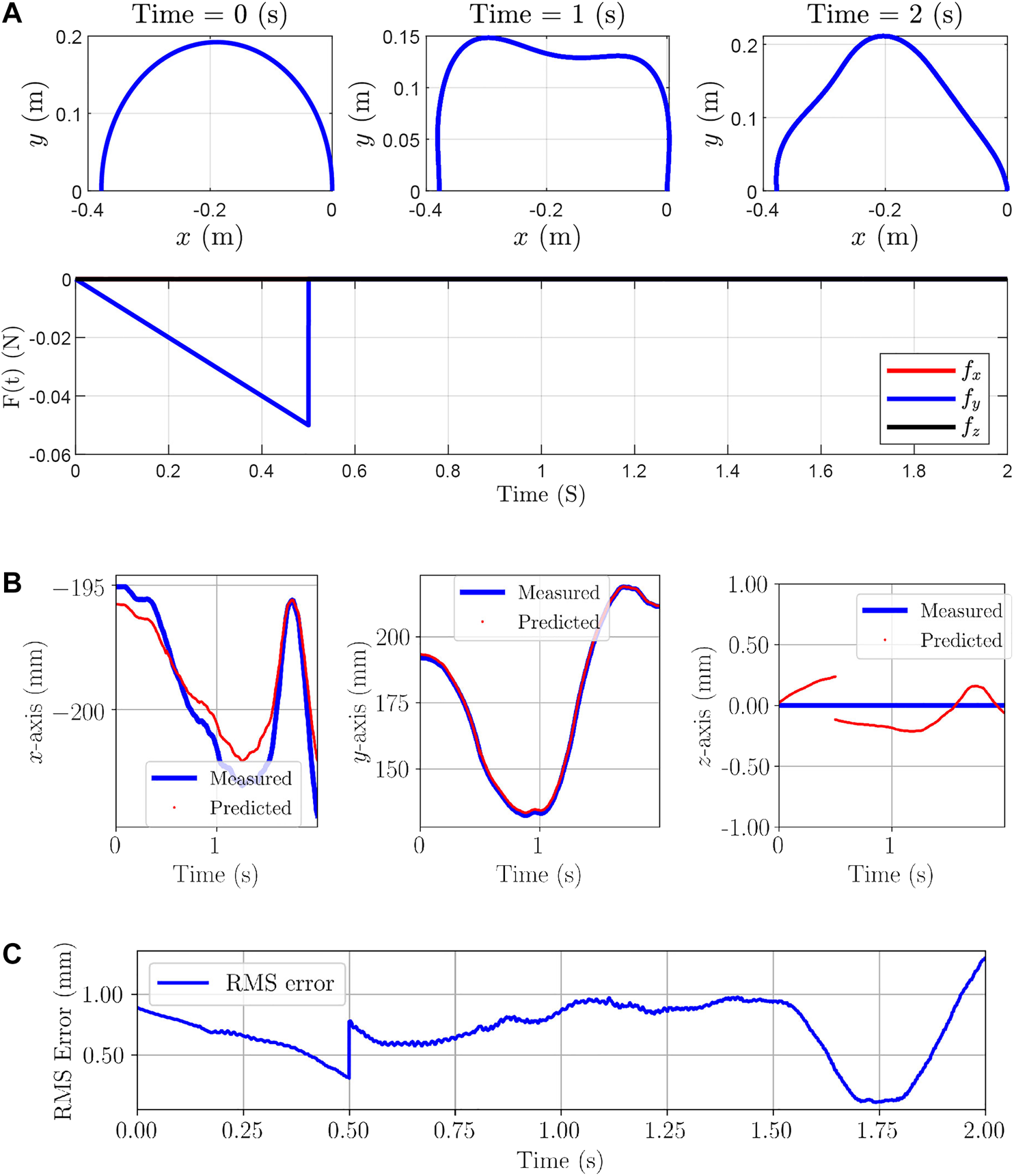 Third simulation example: (A): Initial, Time-evolved configurations and forces applied on the rod. Positions of the middle node, where the force is applied, are measured and predicted. (B): Measured position calculated from analytical dynamic model and predicted by the proposed RNN-based model in the , , and -axes are given. (C) RMS error considering all the axes.