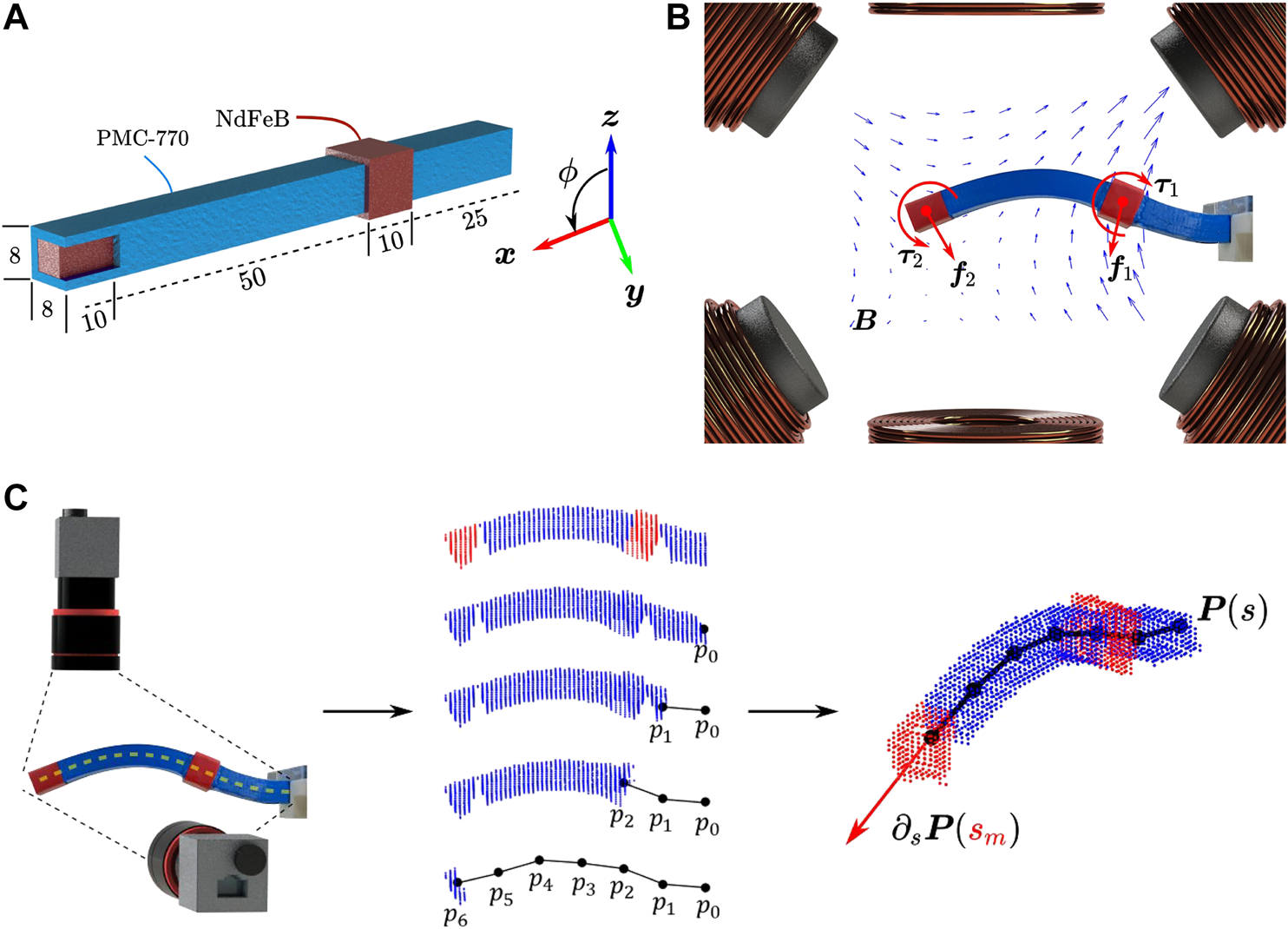 (A): Polymer matrix composite 770 (PMC-770) beam continuum manipulator with embedded neodymium (NdFeb) magnets located at tip and intermediate positions. Dimensions are given in millimeter. (B): Experimental setup consists of six stationary electromagnets and contains a segmented photograph of the final shape manipulator. The flexible PMC-770 and rigid NdFeb sections of the manipulator are blue and red, respectively. Six electromagnets generate a magnetic field () in the workspace, exerting torques and forces (, ) on the magnets, which deforms the continuum manipulator to its final shape at the time s. C: Representation of the shape reconstruction algorithm used for shape feedback. The manipulator is recorded with a stereo vision setup. The manipulator body is represented by a 3D spatial point cloud. The manipulator centerline, characterized by parameter , is approximated by points . A 3D polynomial fit is made through the points, and the magnet orientation at an assumed constant centerline position derived from the local gradient of the polynomial fit.