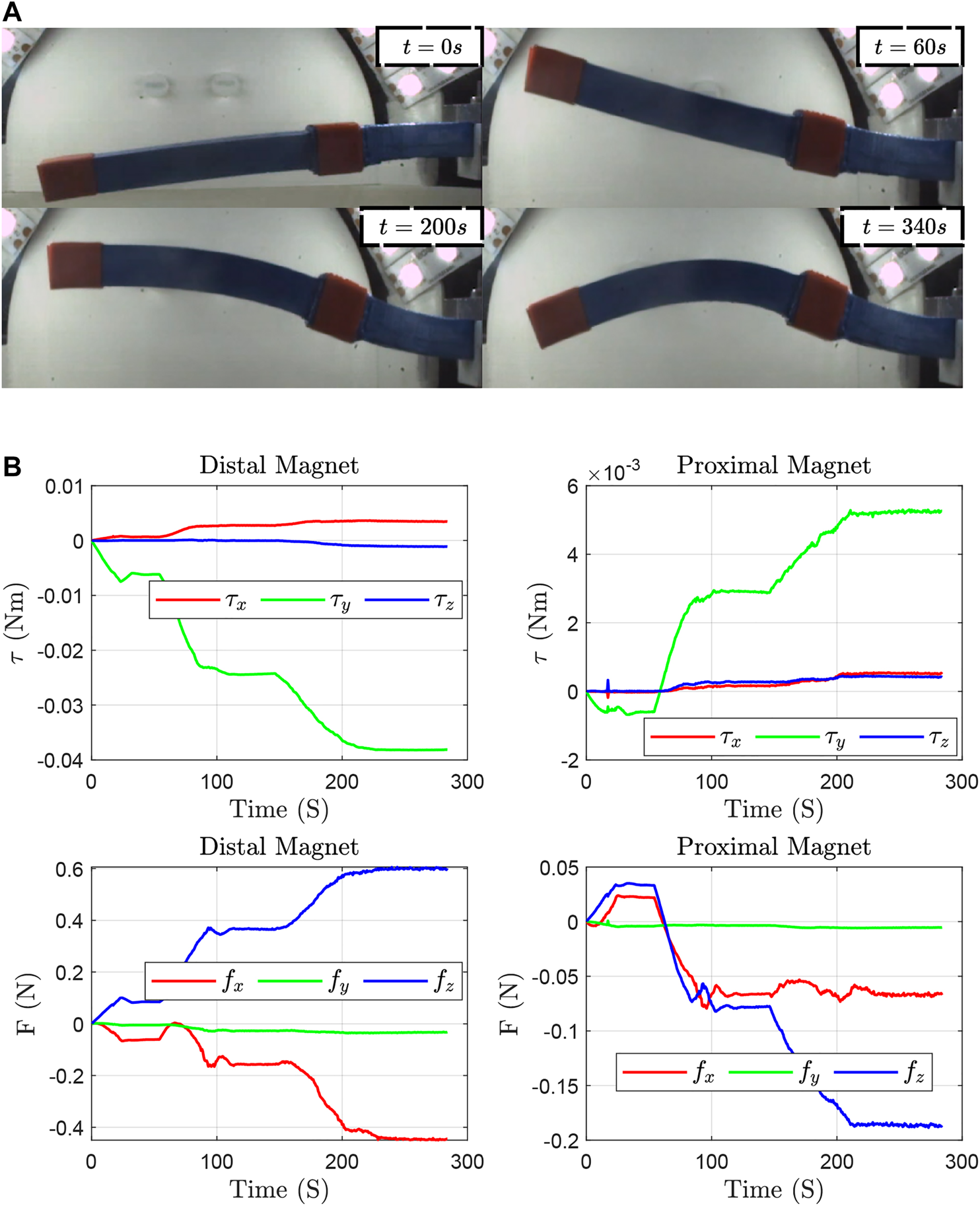 (A): Initial and time-evolved configurations. (B): Applied torques and forces on the distal and proximal magnets.