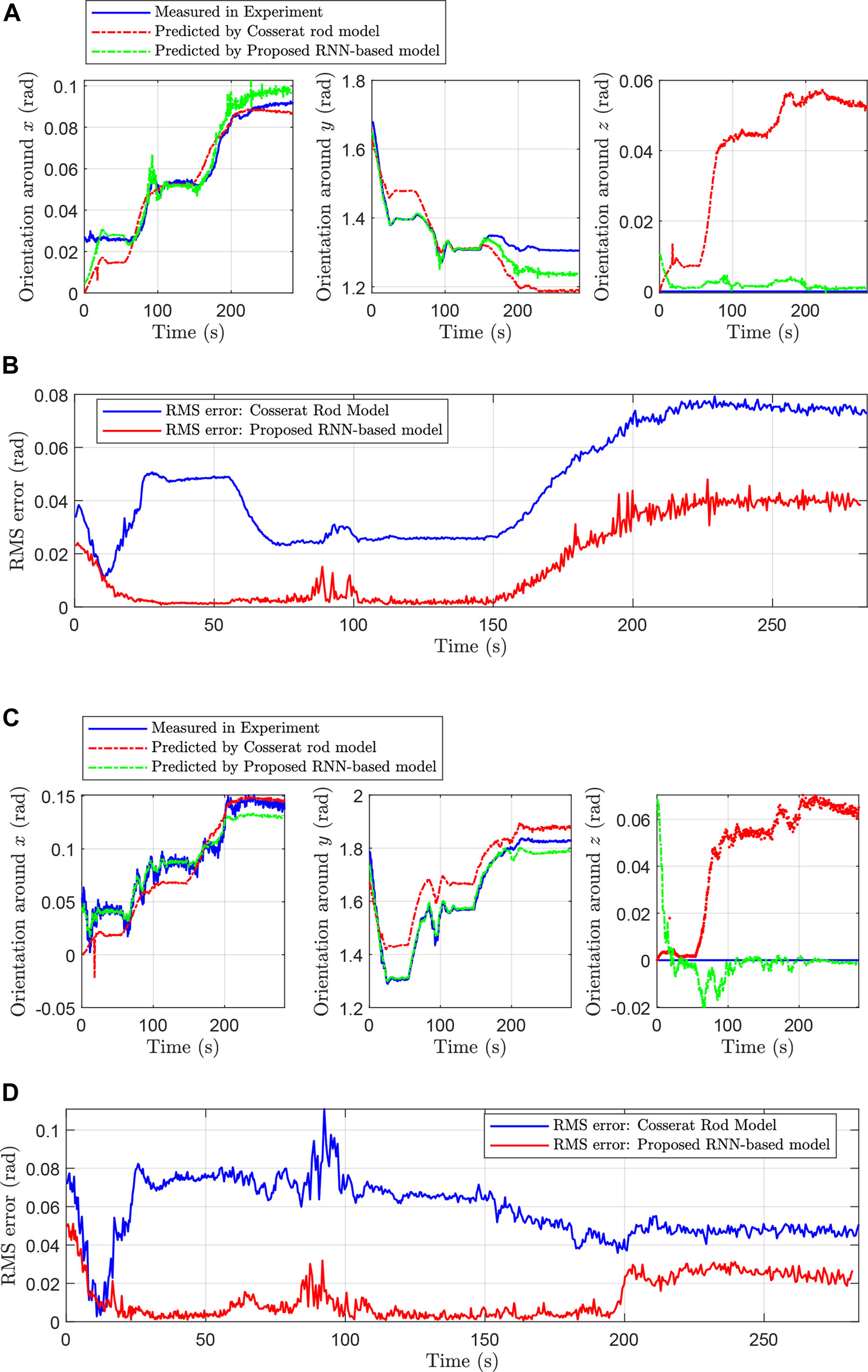 (A): Measured and predicted orientations of tip/distal magnet by Cosserat rod model and proposed RNN-based model. (B): RMS error for distal/tip magnet resulted from Cosserat rod model and proposed RNN-based model. (C): Measured and predicted orientations of middle/proximal magnet by Cosserat rod model and proposed RNN-based model. (D): RMS error for middle/proximal magnet resulted from Cosserat rod model and proposed RNN-based model.