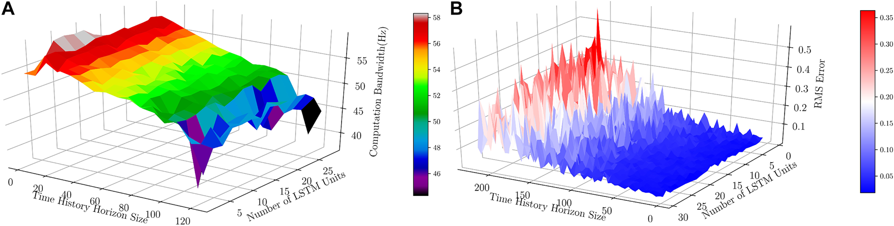 (A): Computation bandwidth (Hz) obtained with respect to different number of LSTM units and size of time history horizon (for number of epochs = 25 and batch size = 1). (B): RMS Error (mm) of the prediction on Data-set IV using trained models with different number of LSTM units and size of time history horizons (for number of epochs = 25 and batch size = 1).