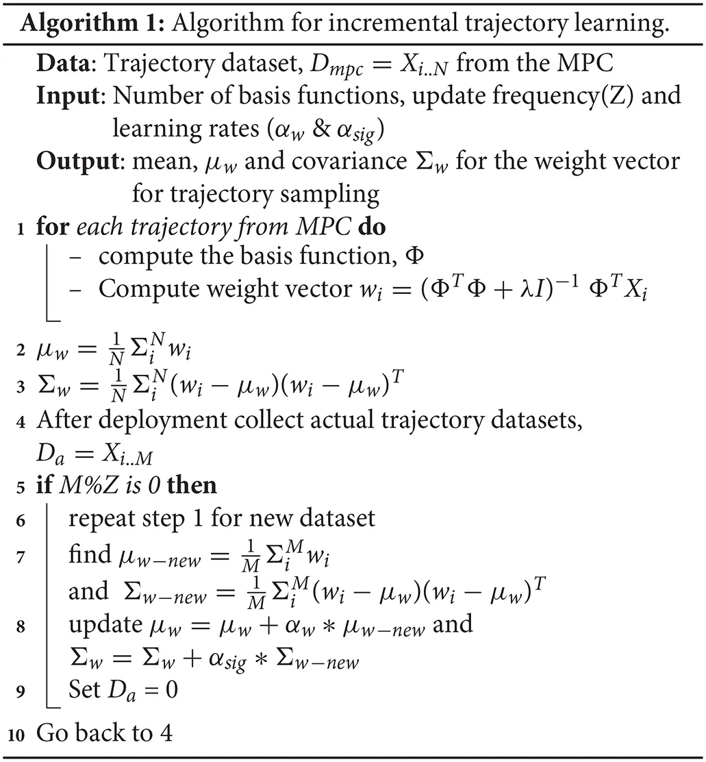 Expert human demonstrations is capable of producing jerk-free trajectories, but in this work, MPC is preferred because micro-gravity hardware experiments are quite expensive and no such facilities were available to carry out human demonstrations. The key equations that describe the learning process are reproduced from Shyam et al. (2019) as follows: the trajectories are assumed to be independent and identically distributed Gaussian with a mean and co-variance matrix.