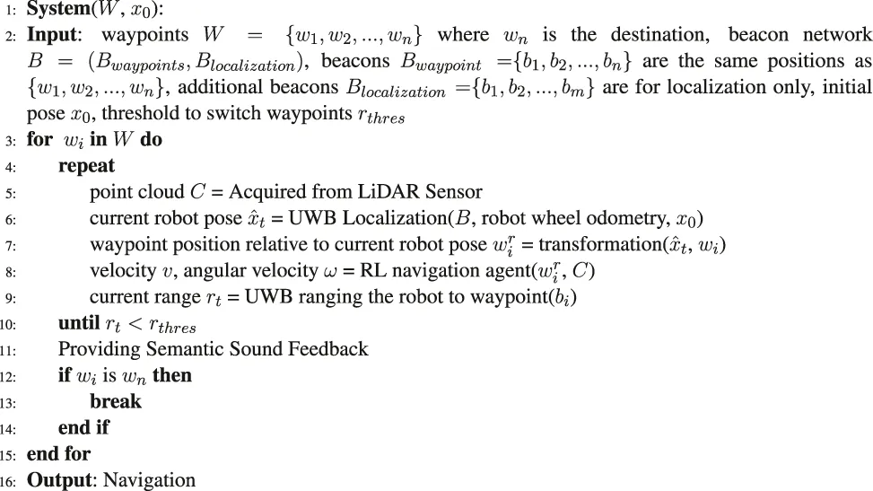 UWB beacon, navigation, blind and visually impaired, guiding robot, verbal instruction, indoor navigation, deep reinforcement learning