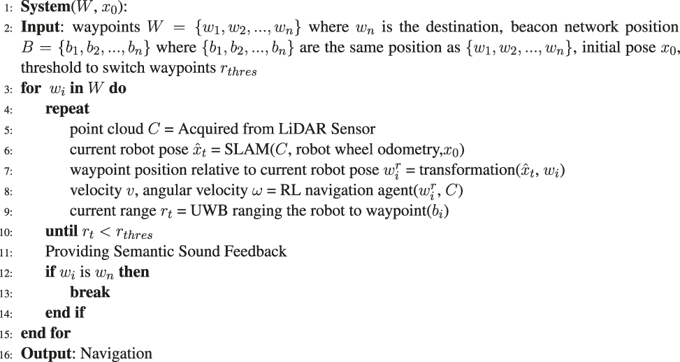 The key components of the designed system are displayed in Figure 4. The UWB/voice beacons are placed at certain POIs, such as restrooms, elevators, or gates and doors, as waypoints and other location to enable positioning. The LiDAR point clouds indicate the state of the environment, and the destination location (the current waypoint) estimated using the SLAM algorithm or through UWB localization is directly fed into the navigation agent. The navigation agent is a DRL policy that outputs a velocity v and an angular velocity ω to the motor controller without using a path planning algorithm. Excluding the communication between the robot and the beacons, all the remaining messages were exchanged between the components through the robot operating system (ROS). The pseudocode of this system is presented in Algorithm 1.
