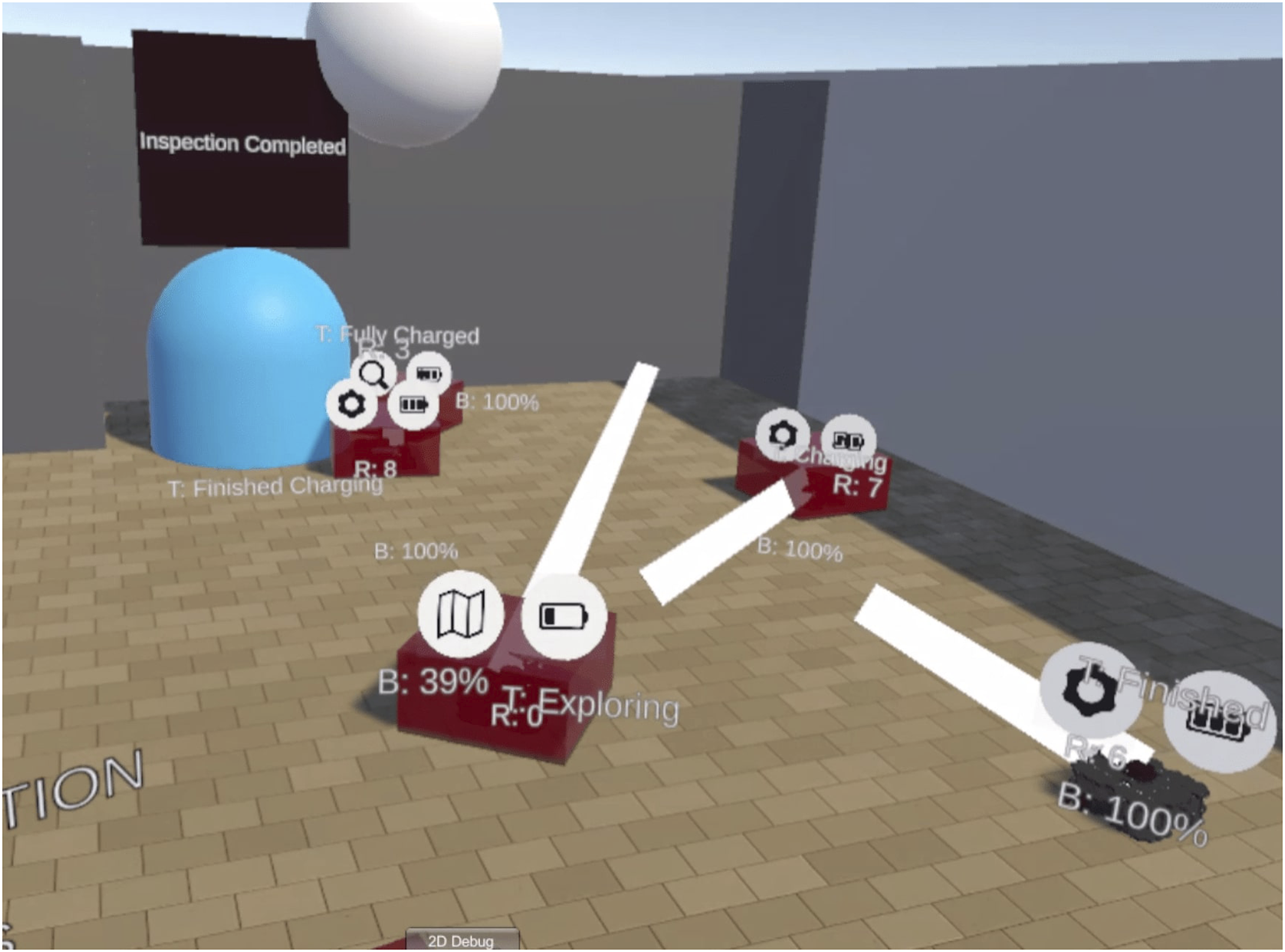 Internal robot information (referred to as L1) includes robot number (each robot is assigned a unique number), task status (textual and numerical data) and battery percentage. This layer is comprised of textual information and could include other types of information if desired. Information for L1 is stored within the Unity (C#) scripts that implement the VR interface, and is relayed directly to the user. Elements in this layer are displayed in Unity using a TextMeshPro object. Each label has its rotation set to face the player camera and its position is set by the result of three forces. The first force attracts the label towards the robot that it is labelling. The second force repels labels away from each other. The third force attracts the labels to a plane that is perpendicular to the direction of the player camera. The resulting 3D force is applied to each text label attached to the robots in order to minimise overlapping and maximise legibility of labels. This layer is shown in Figure 5 (L1).The second layer (referred to as L2) is a set of two icons that are attached to a point above each robot. These icons display battery status (low, medium or high level of charge) and robot category. Robots can be one of three categories: Explorer, Support and Inspector. This layer is shown in Figure 5 (L2). Information within L2 is stored within C# scripts that run the experiment.