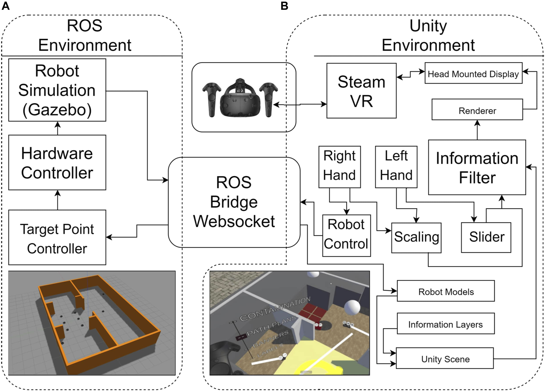 An overview of the setup that contains the ROS simulation (Ubuntu, A) and the Unity VR program (Windows, B). The communication between the computers used the Rosbridge Websocket.
