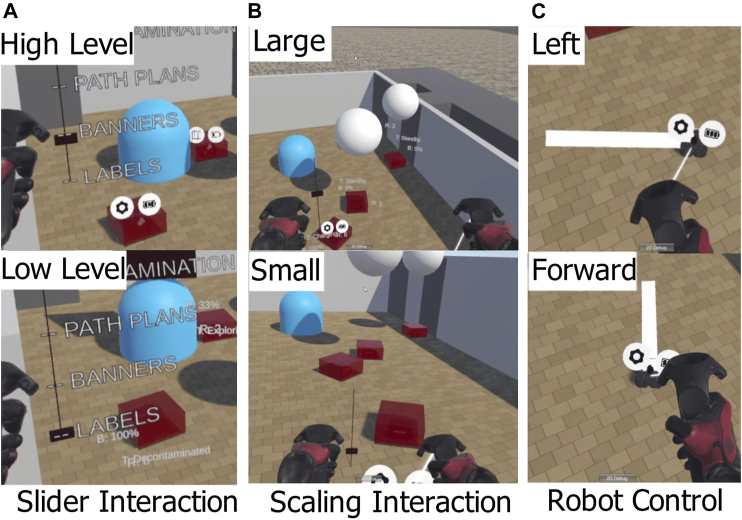 The communication between the simulation in ROS and the VR system used the Rosbridge Websocket (Mace et al., 2014)). This allows systems outside of ROS to send and receive messages using JSON serialisation. In Unity, the JSON messages are interpreted using the Siemens ROS-Sharp package (Bischoff, 2017). The simulated robots use two wheel differential drive to control angle (yaw) and speed. For this experiment, the control of each robot was simplified to a point to point controller. When the controller is supplied a target pose, the robot turns on the spot to face towards that position, moves forward until it is within a 2.5 cm radius of that position and stops. All robot simulation and control was carried out in ROS Kinetic (Quigley, 2009). A ROS node receives messages from Unity when the user instructs a robot to move. The VR headset used was the HTC Vive (Niehorster et al., 2017) and the 3D interface was built using the Unity game engine (Bartneck et al., 2015). The robot models were displayed in Unity with the same position as in the simulation. The user can set the target position of robots, move around the environment, interact with a slider and change the scale of the user relative to the environment. These capabilities are shown in Figure 3. To virtually move around the environment, the user can press a side button and move the controller. The user’s perspective is translated along the vector of the difference between the controller position and the position when the button was initially pressed. This allows the user to move around the environment without physically moving around using their feet.