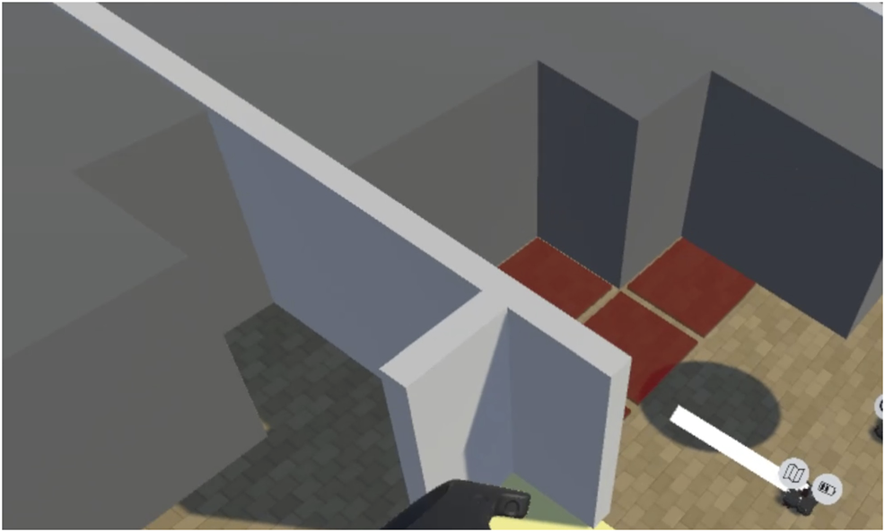 The state of exploration is represented in the Virtual Environment as a “fog of war” type system. Opaque grey blocks obscure regions of the environment that have not been verified by an Explorer robot. This is shown in Figure 4. When an Explorer robot moves to within 1.5 m of an unexplored region, the region is marked as explored. This means that the opaque block disappears, allowing that part of the environment to be seen by the operator. The explored portions of the map are updated through a C# script in the Unity environment. This system enforces the idea that, while the state of the environment is known to some degree at the start of the work being carried out, it must be verified before any robots can safely operate in that area.