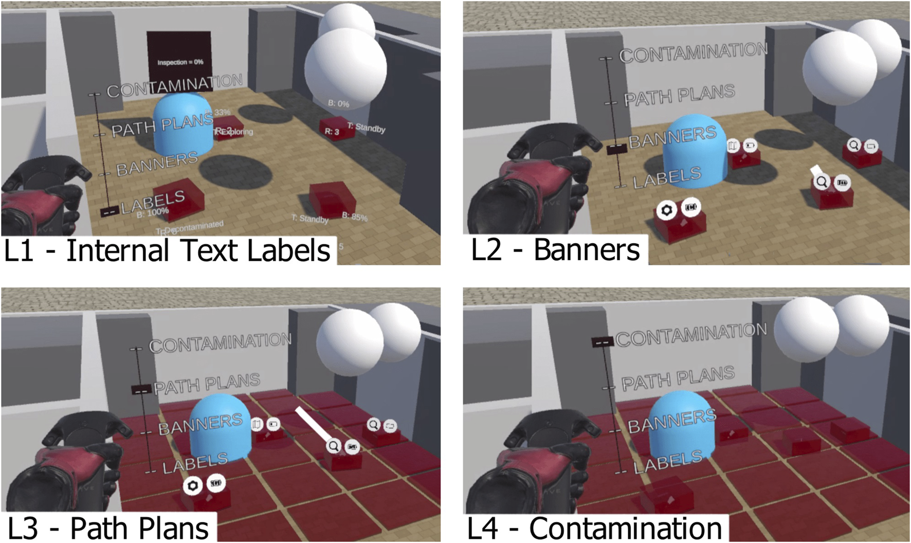 The four layers of information displayed. L1 is textual labels displaying internal information about the robot (e.g. task being performed). L2 has banners displaying external information about the robot (e.g. type of robot). L3 displays lines that represent the planned paths of each robot. L4 displays “contaminated” areas within the environment.