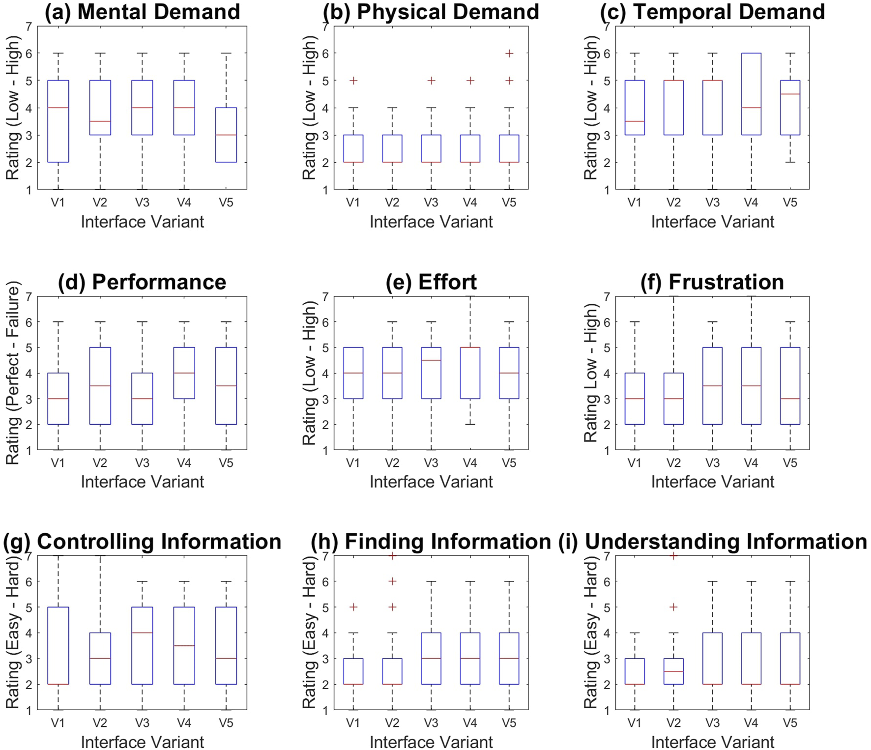 Figure 6 shows box and whisker graphs for the 9 factors users rated between 1 and 7. We performed ANOVA one way statistical analysis (significant threshold = 0.05) on all factors in the experiment, with the independent variable being the variant of the interface (V1–V5). One-way ANOVA determined no significant difference between groups [F (4,125) = 2.1692, p = 0.0763] for the “Finding Information” category (shown in Figure 6H), however a Tukey post hoc test (p = 0.0399) revealed that V1 (2.3462 ± 1.1981) was significantly rated better than V5 (3.4231 ± 1.3616). The effect size corrected for sample size was Cohen’s d = 1.4827. Users found it significantly easier to find information with Interface Variant V1 (where all information was available to them independent of scale, and no filtering occurred) than with Interface Variant V5 (where Semantic filtering and Spatial filtering were linked to the scale of the user). This indicated that the combination of spatial and semantic filtering made the act of finding information be perceived as more difficult than in the baseline case. Other factors had no significant effects between interfaces.