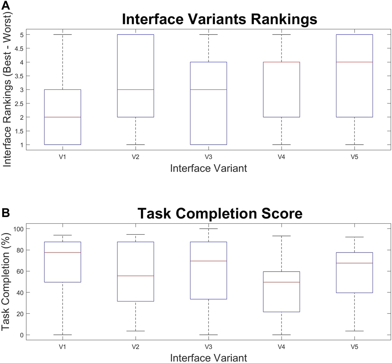 After completing all of the tasks, the participants were asked to rank the interfaces from 1 to 5, with 1 being the best. A box and whisker plot of these rankings are shown in Figure 7A. The participants also had their completion of each task measured for each interface variant. This metric corresponds to how much of the task the participant was able to complete and time for completion. The formula to determine this metric is explained in the Experiment Design section. A box and whisker plot for this data is shown in Figure 7B.
